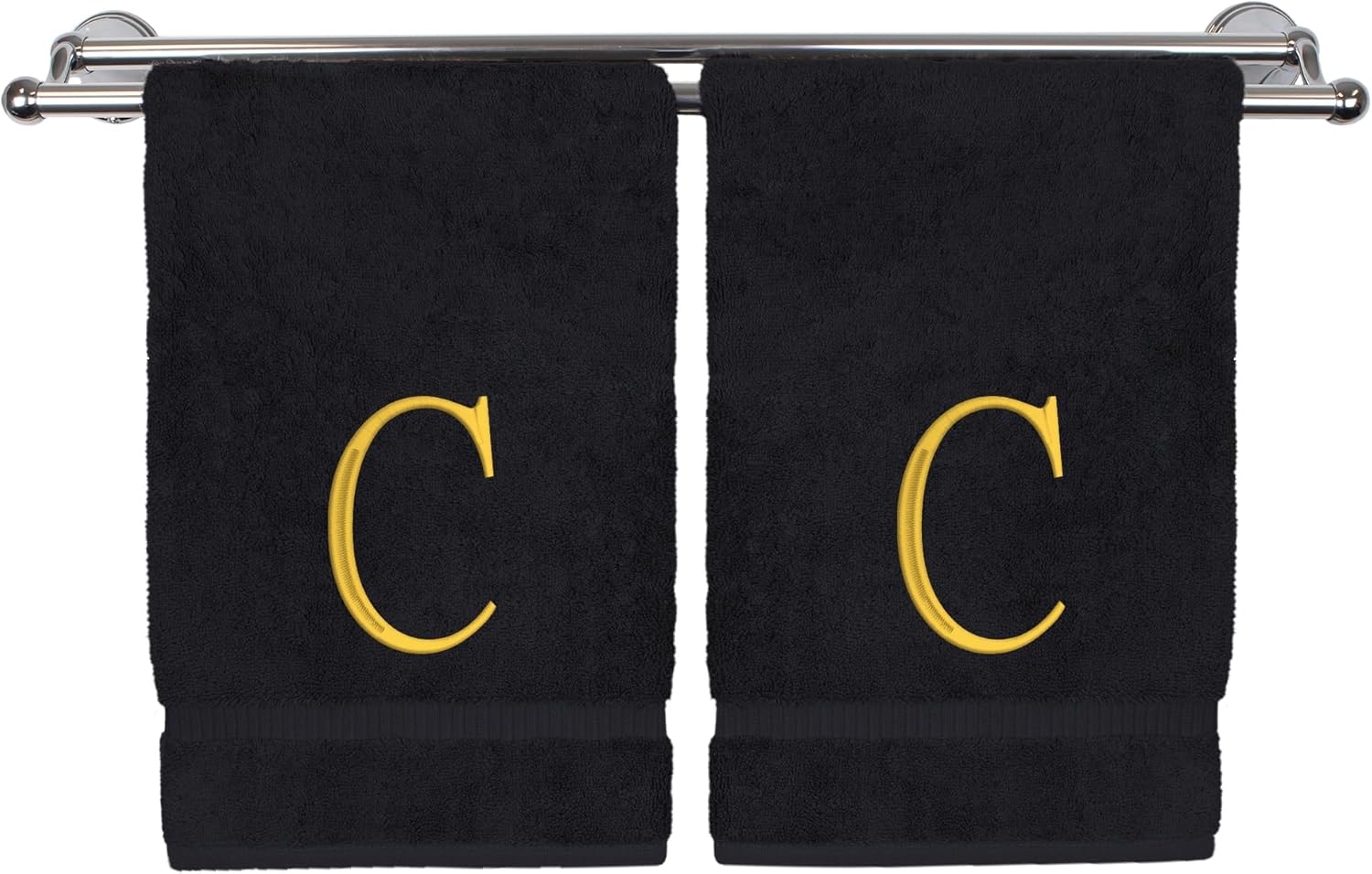 Monogrammed Hand Towel, Personalized Initial Gift, Extra Absorbent 100% Turkish Cotton - Soft Terry Finish - Set of 2 - Gold Block Initial C - Embroidered on Black Towels
