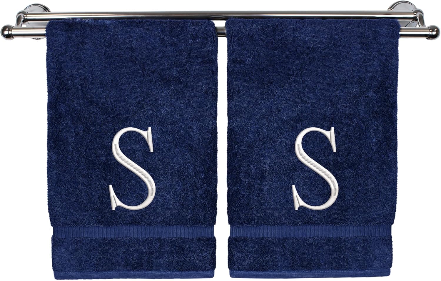 Monogrammed Hand Towel, Personalized Initial Gift, Extra Absorbent 100% Turkish Cotton - Soft Terry Finish - Set of 2 - White Block Initial S - Embroidered on Navy Blue Towels