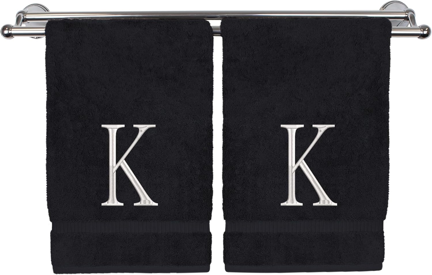 Monogrammed Hand Towel, Personalized Initial Gift, Extra Absorbent 100% Turkish Cotton - Soft Terry Finish - Set of 2 - White Block Initial K - Embroidered on Black Towels