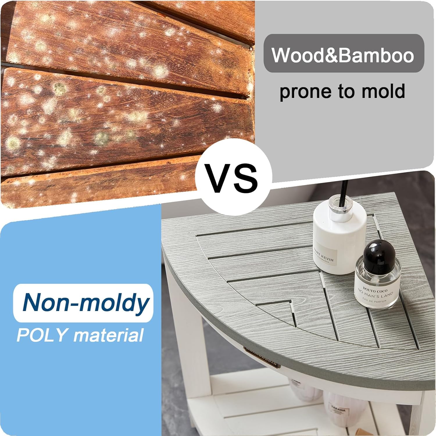 - ăMaterial & SizeăOur corner shower stool is made of polystyrene, it looks like real wood from out look, but actually it's a heavy duty plastic, no splinters and no maintenance (13 x 13 x 17.3 Inches).