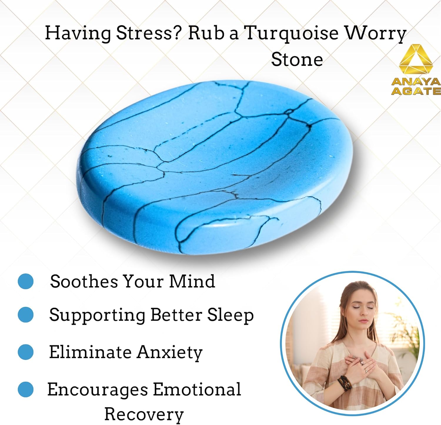 - Say Goodbye to Stress: If you are struggling with anguish in stressful situations, it’s time to find your calm and soothe your mind with the Anaya Agate worry stone! Our healing crystals and stones are here to help you deal with anguish and stress and restore your balance.