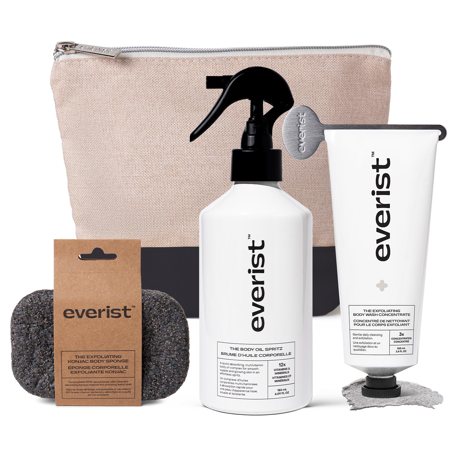 Everist The Exfoliating Body Ritual Set, 3.4 fl. oz Exfoliating Body Wash Concentrate, 6.09 fl. oz Body Oil Spritz & Konjac Sponge in Jute Travel Bag, Cleansing & Hydrating For All Skin Types