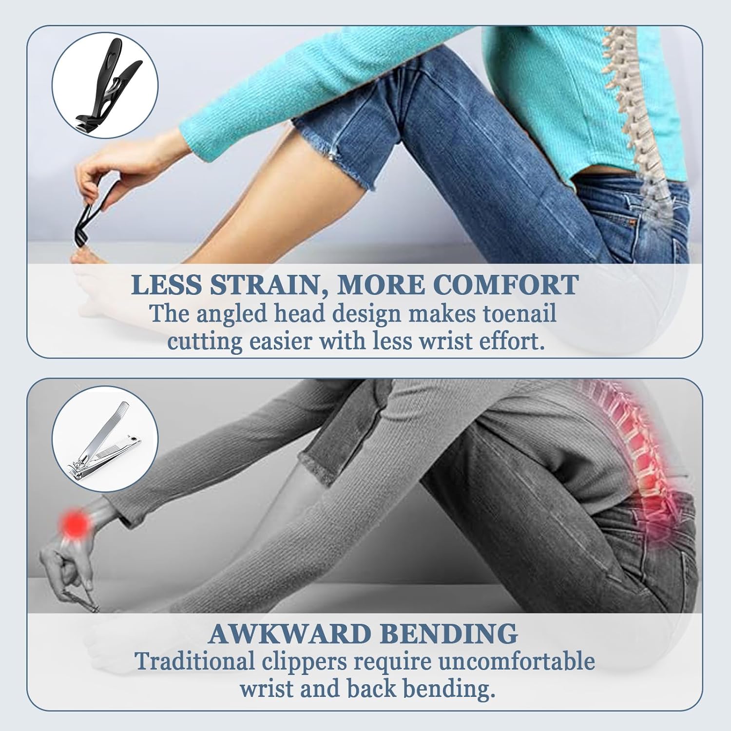 - Practical Nail Clippers: Trim nails with ease using our ergonomic toenail clippers and nail file, designed for seniors. The wide jaw and angled head of our nail clippers for men allow you to clip thick nails without awkward bending, making nail care easier
