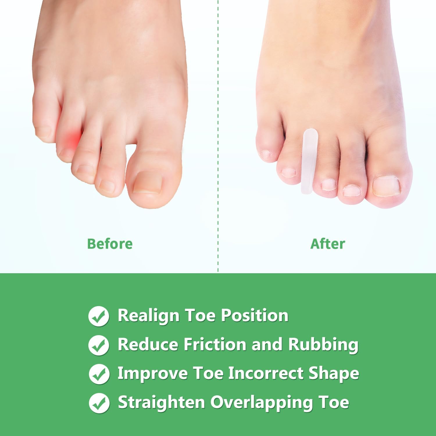 - Washable and Reusable: The toe separators are washable and reusable. Rinse with clean warm water and air dry. When reusing them, please sprinkle talcum powder to keep them unsticky. Soft and stretchy gel materials are comfortable to wear on.