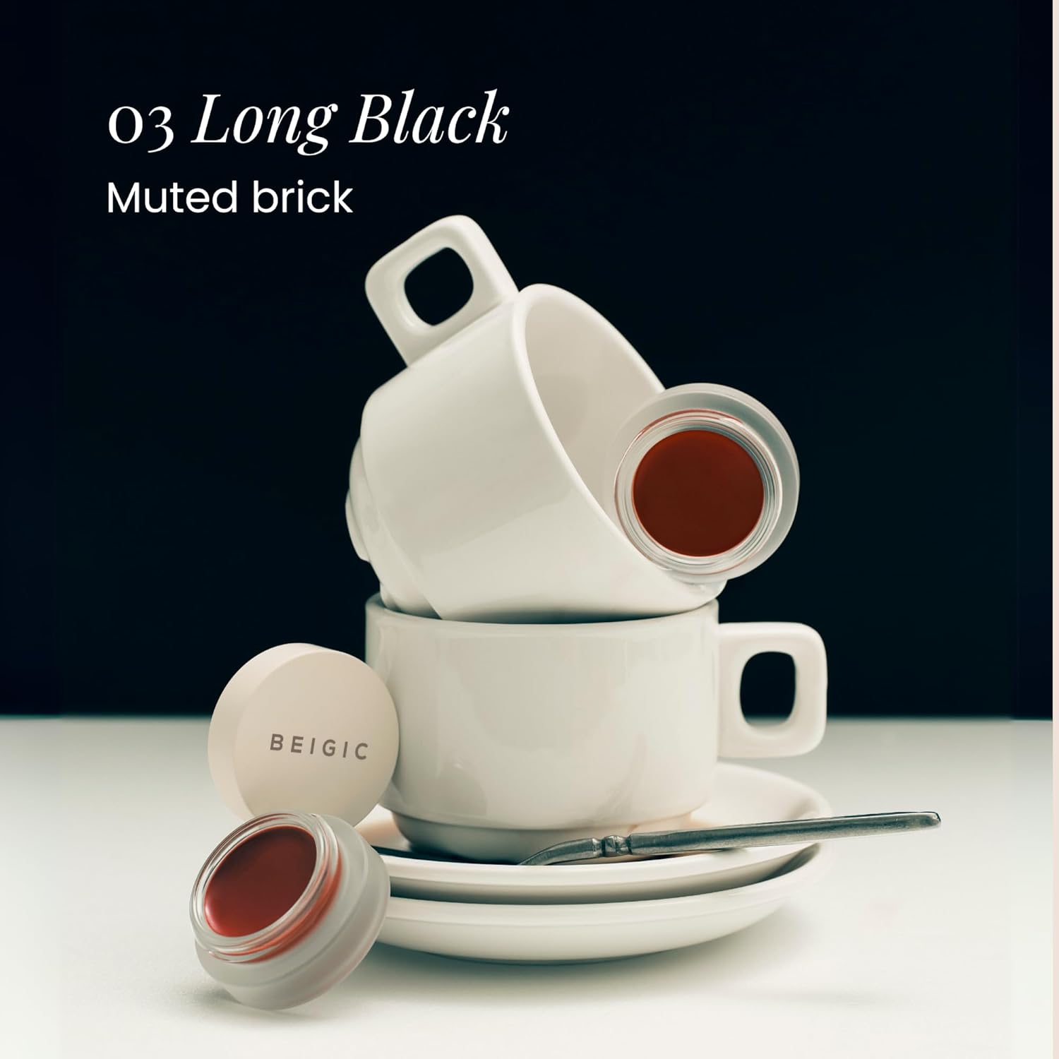 - 03 LONG BLACK: A warm, earthy burnt terracotta that adds a chic, modern touch. This versatile shade can be used to create a subtle contour on cheeks or as a powerful, elegant color for a statement lip.