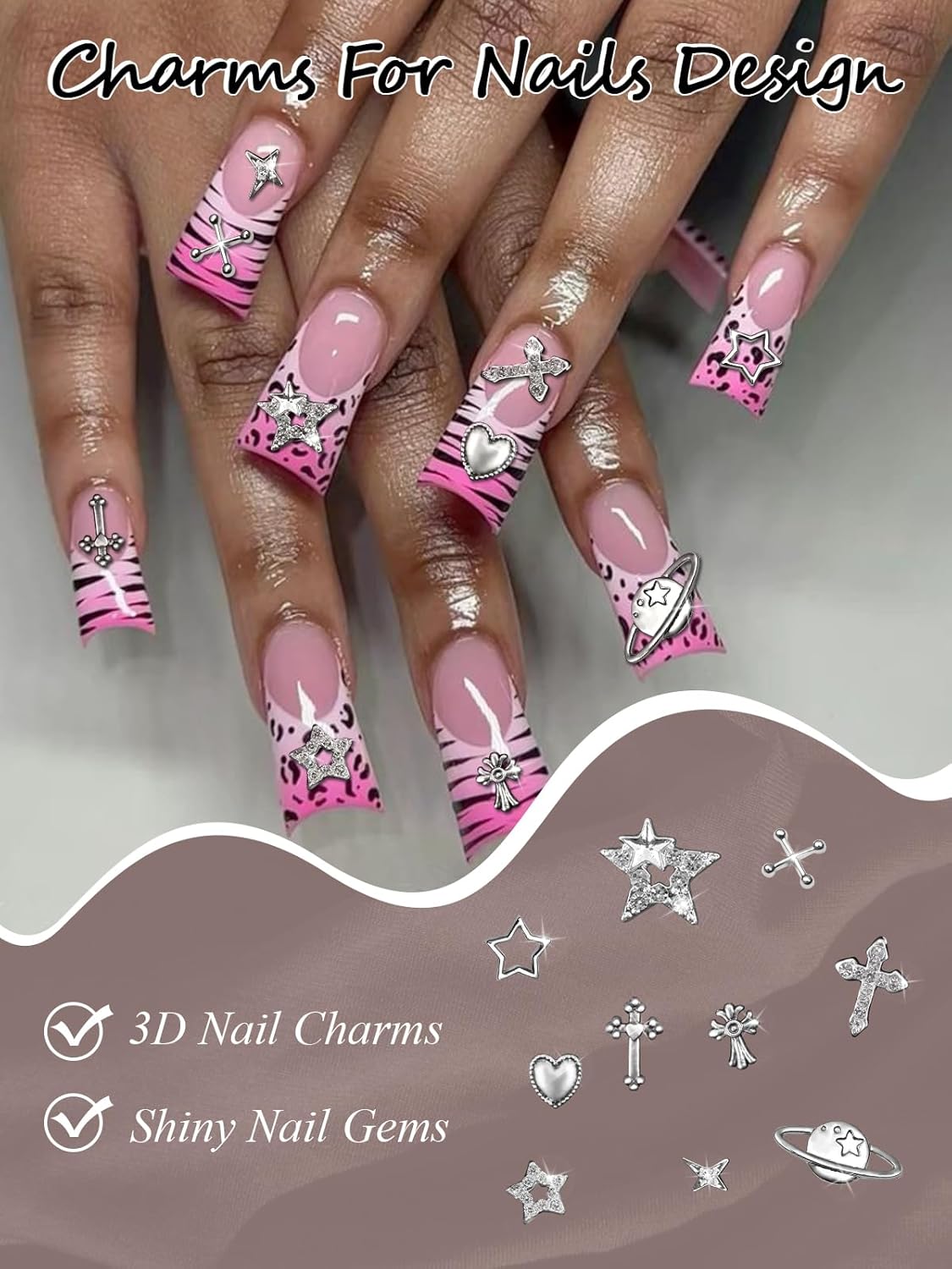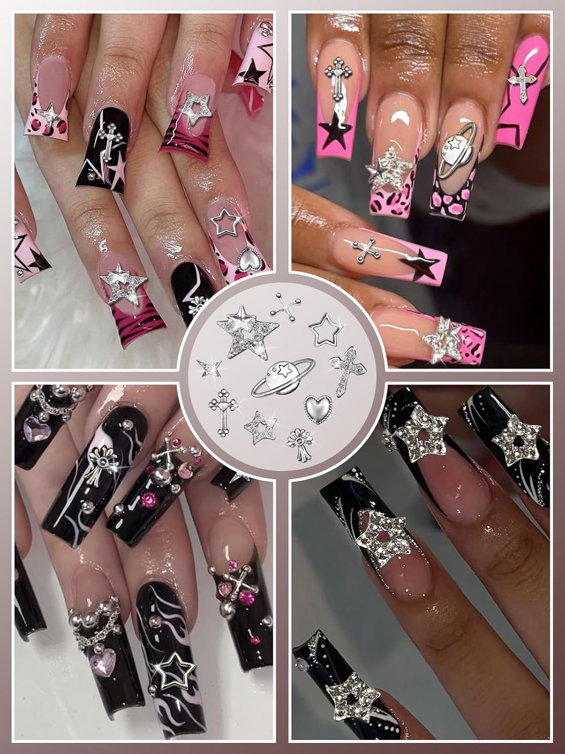 - 【Rich Styles of Nail Charms】100Pcs nail charm collection of eye-catching designs featuring stars, hearts, planets, crosses, and Y2K-inspired silver alloy decorative elements. You can apply these sparkling nail charms and gems to decorate your nails.