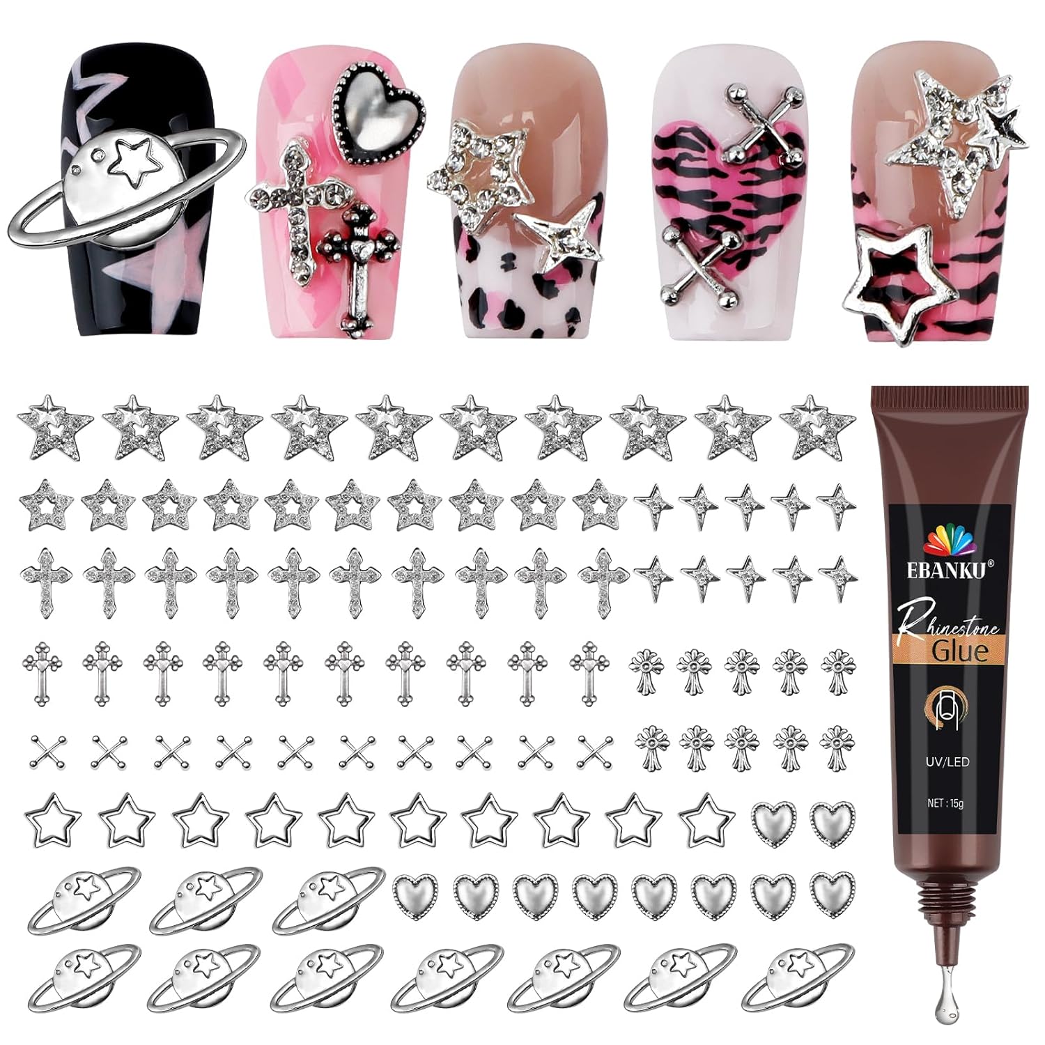 EBANKU Nail Charms for Nails, 100 PCS Nail Charms Y2K Bulk Set with 15g Nail Rhinestones Glue, Star Heart Planet Cross Alloy Nail Gems 3D Silver Stars Nail Jewels Accessories for Acrylic Nails