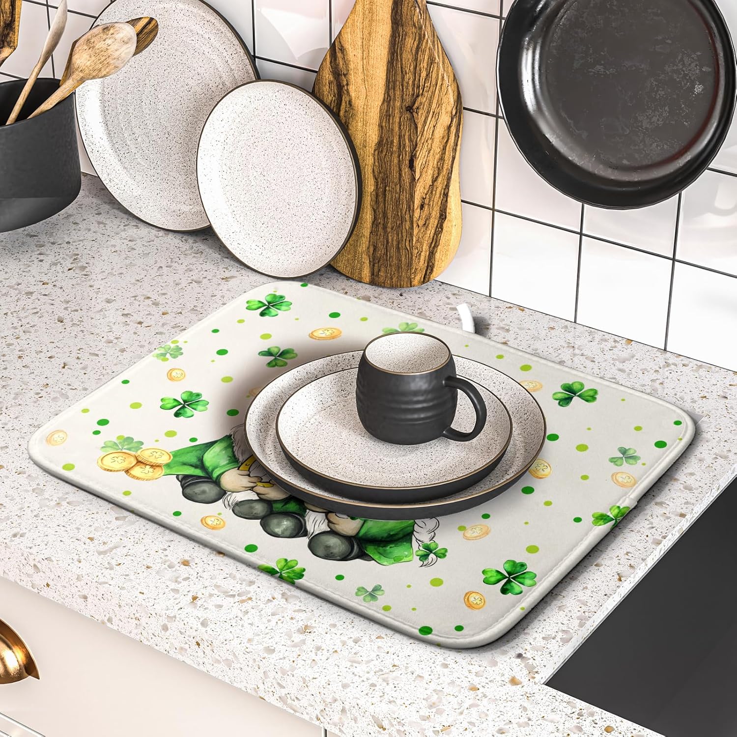 St Patrick's Day Gnome Dish Drying Mat 16x18 inch Lucky Shamrock Absorbent Reversible Dishes Drainer Rack Mat for Coffee Bar Kitchen Decor