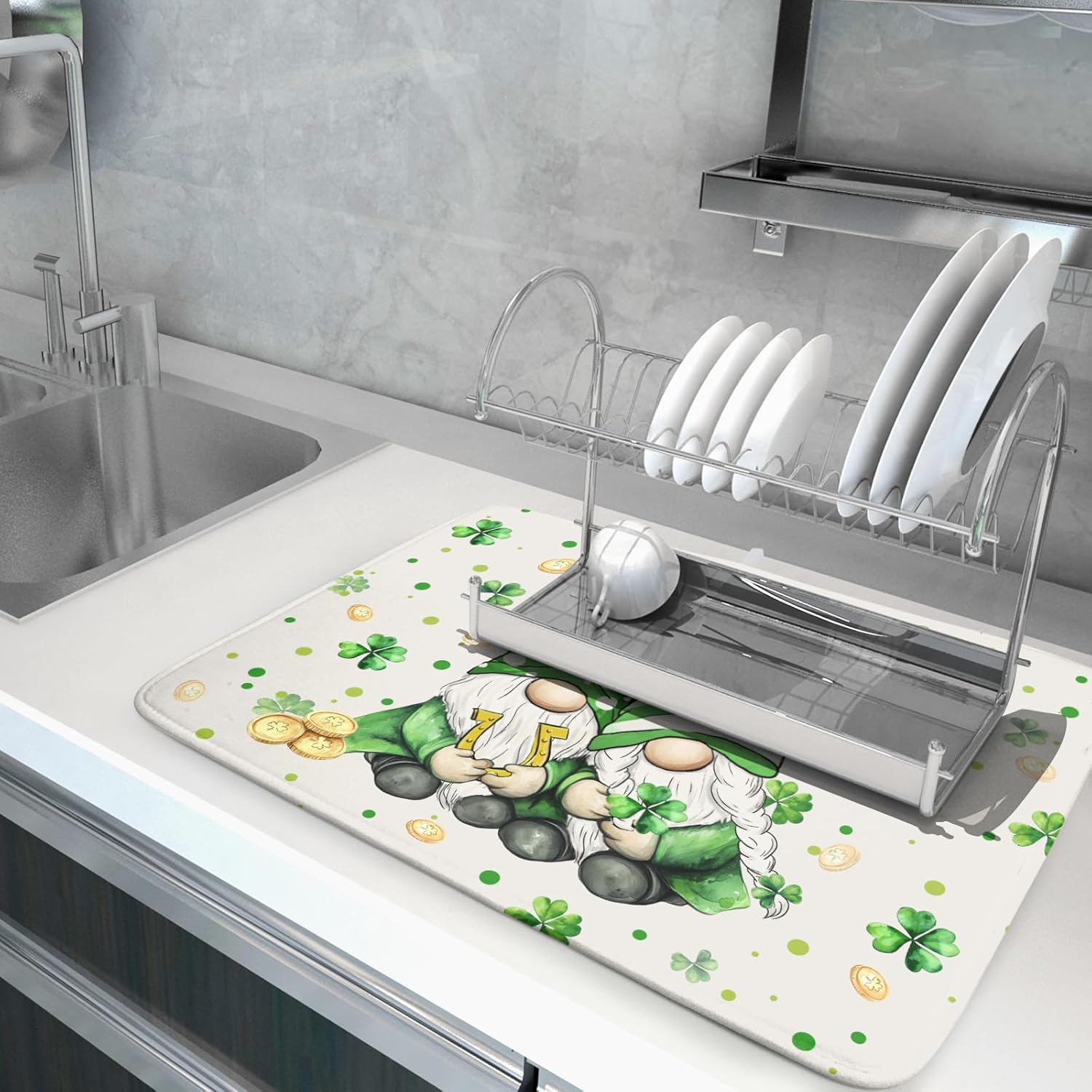 St Patrick's Day Gnome Dish Drying Mat 18x24 inch Lucky Shamrock Absorbent Reversible Dishes Drainer Rack Mat for Coffee Bar Kitchen Decor