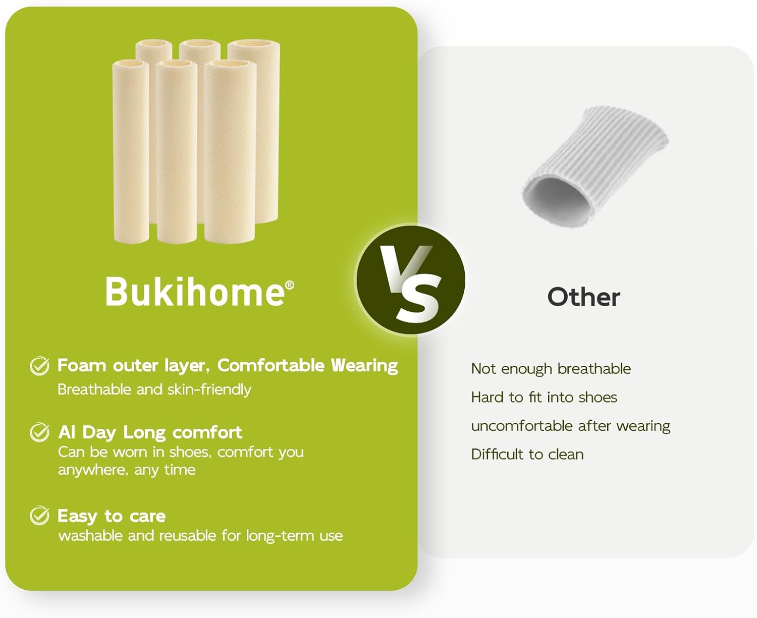 - Pain Relief for Foot Issues: Bukihome toe sleeves perfect for caluses, blisters, corn, bunions, hammer toes and more! These foam toe protectors also alleviate pain and discomfort caused by rubbing, missing toenails, ingrown nails, sore spots, or blisters, promoting a more comfortable walking experience.