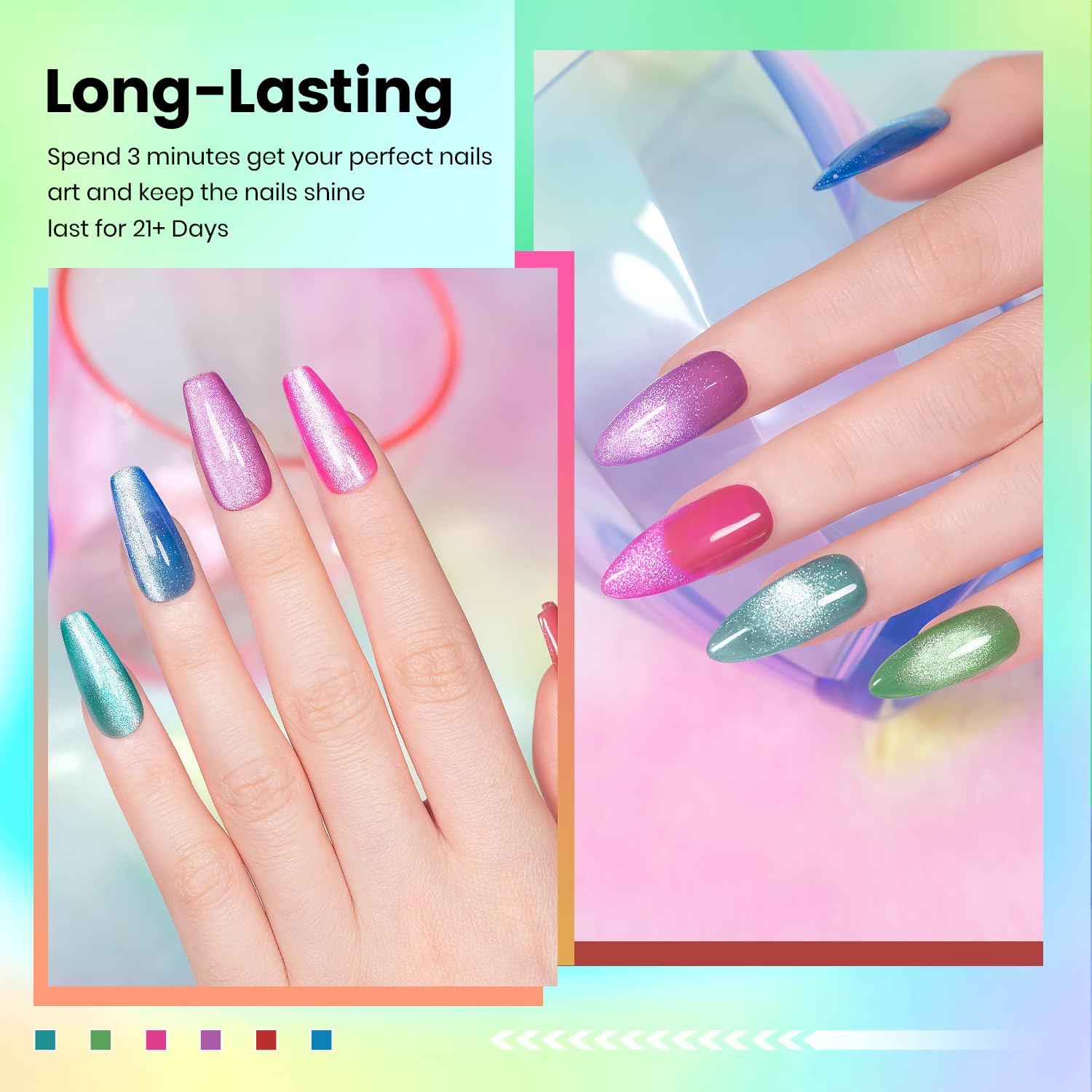 - EASY TO APPLY:This magnetic cat eye gel polish set is made with natural resin ingredients, magnetic shimmers, silver pigments, and a resin formula, so this gel polish set won't cause smudges cracks or chips. It can last for 21+ days with perfect shine under the proper application