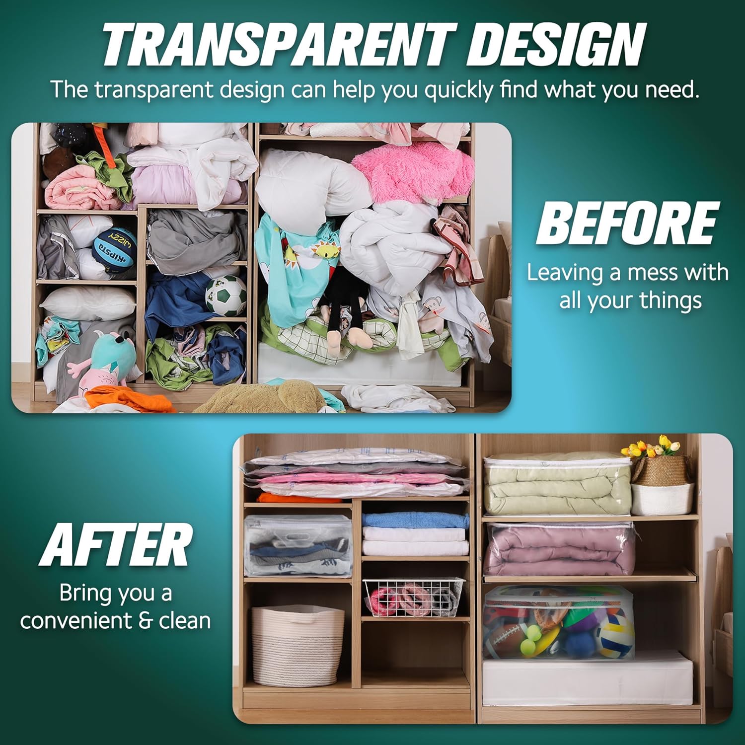 - Transparent and Airy Design: The semi-transparent plastic of these storage bags provides a clear view of the contents, enabling you to easily spot the clothes you've stored away. The breathable mesh fabric along the zipper ensures proper air circulation, contributing to the freshness, thus keeping your stored items clean and well-ventilated for an extended period.