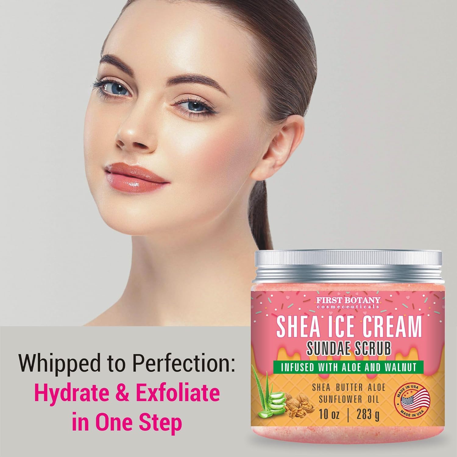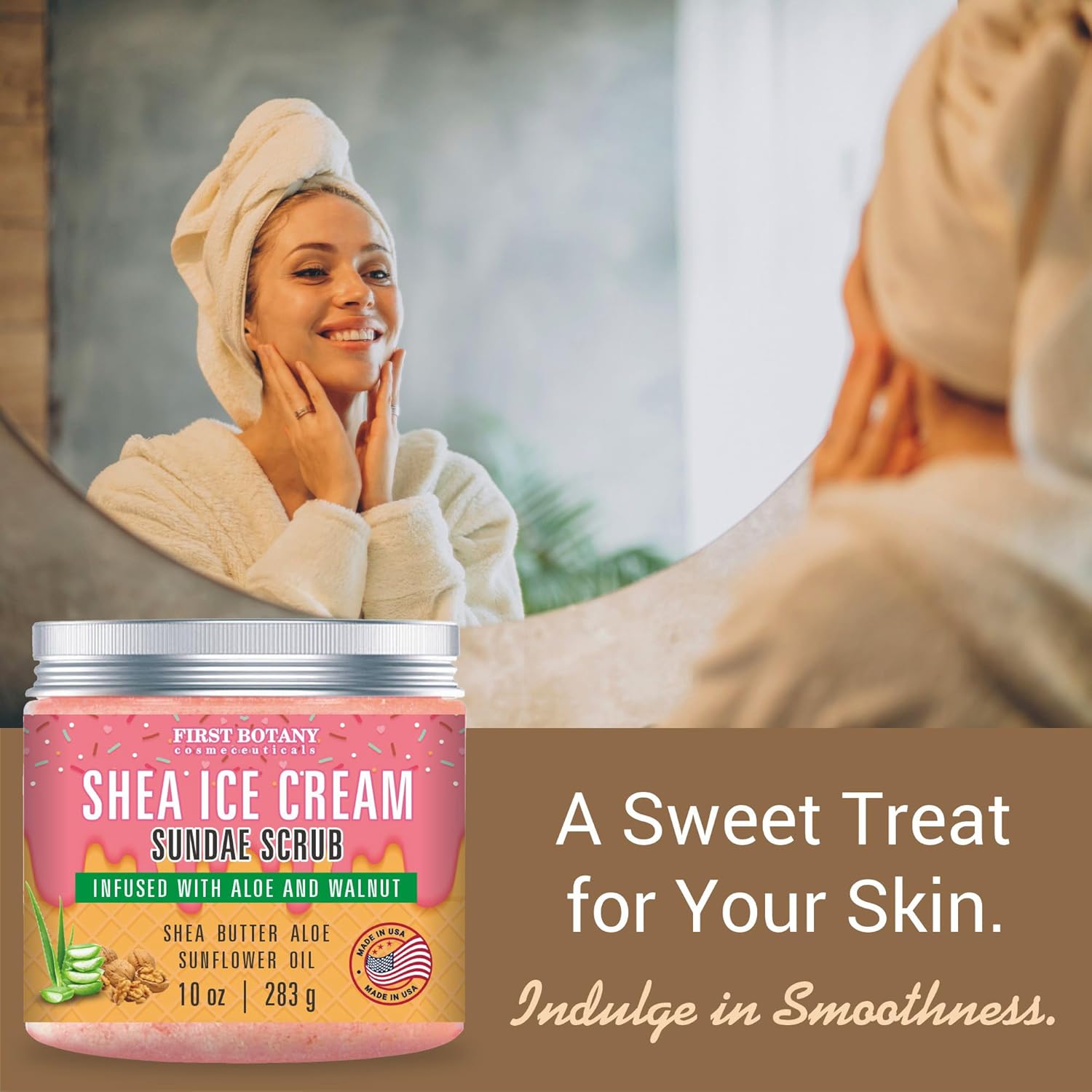 First Botany Body Scrub - Natural Exfoliating Salt Scrub & Body and Face Souffle helps with Moisturizing Skin, Acne, Cellulite, Dead Skin Scars, Wrinkles (10 fl oz, Shea Icecream)