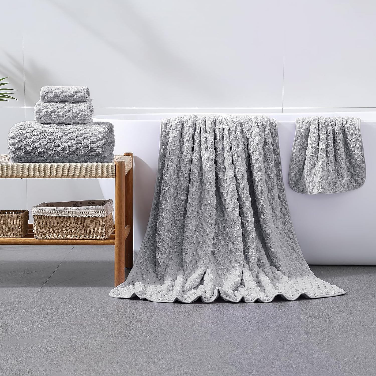 - HIGH WATER ABSORPTION: This microfiber bath towel features a fluffy checkered pattern design, offering super absorption and quick-drying performance. It can hold up to 12 times its weight in water, quickly wicking moisture from your body. Enjoy a luxurious and cozy experience after every bath