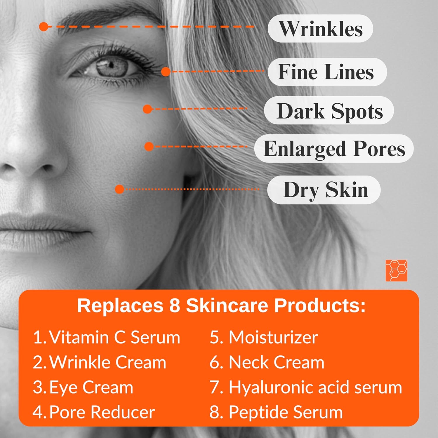 - Reduces Fine Lines and Wrinkles: Powerful wrinkle fighting ingredients like niacinamide, panthenol, ceramides, Tridecapeptide-1, Palmitoyl Tripeptide-5, & Sodium Acetylated Hyaluronate.
