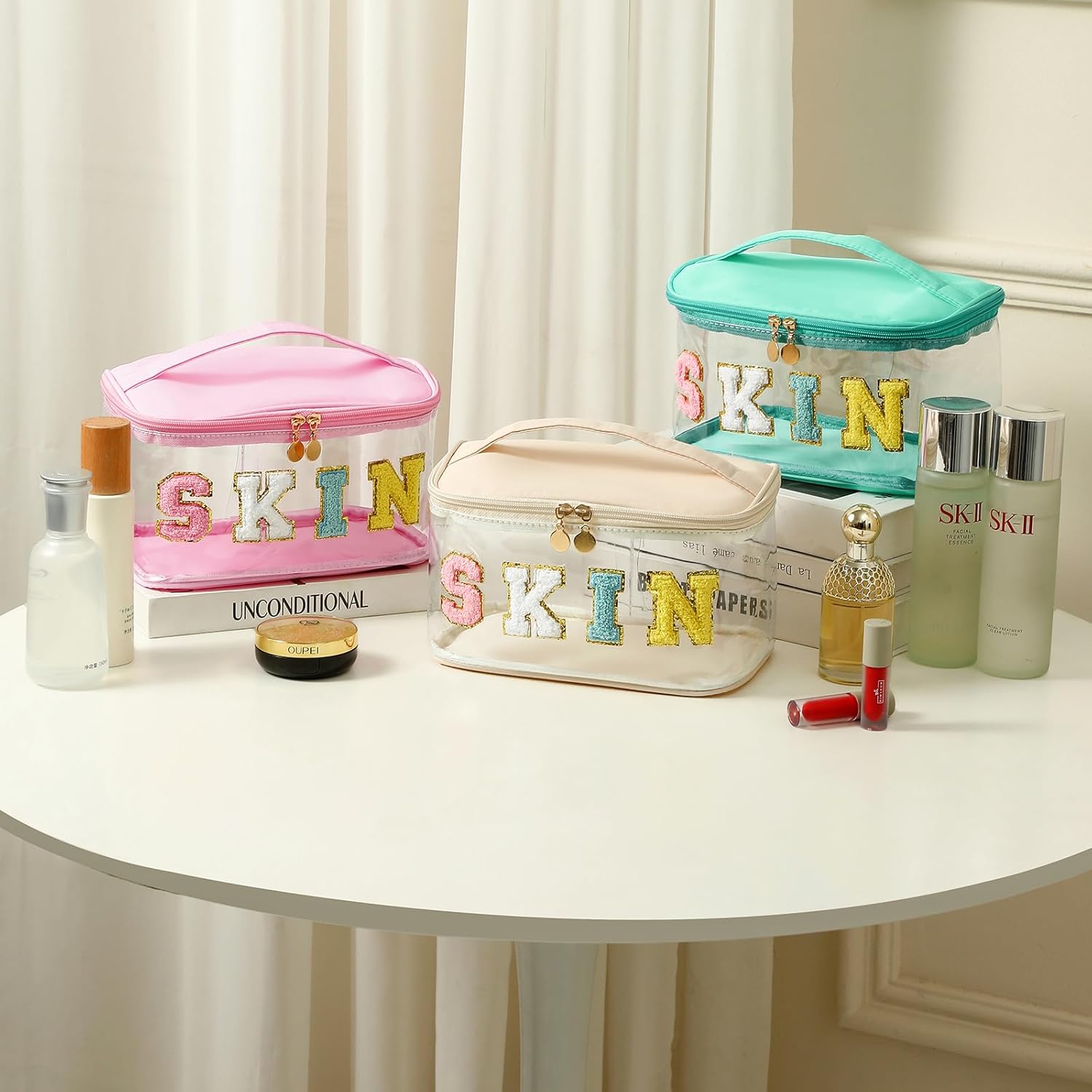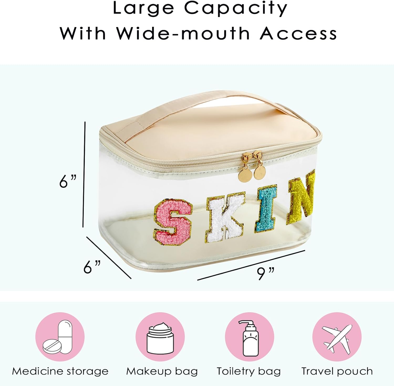 Personalized Chenille Letter Clear Skin Makeup Bag, Large Size Waterproof Nylon Cosmetic Toiletry Storage bag with Top Handle, Transparent Meds Skin Travel Organizer Cosmetic Bag(11Skin-Beige)