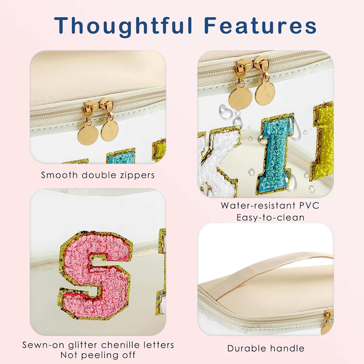 - [Sewn-on Letters]: Our chenille letter bag is made of good quality and thick nylon material, Colorful preppy chenille letters sewn firmly on the transparentbag, lightweight and durable, waterproof and reusable, which is easy to clean and not easy to break, it can serve you for a long time and provide you with a nice using experience.