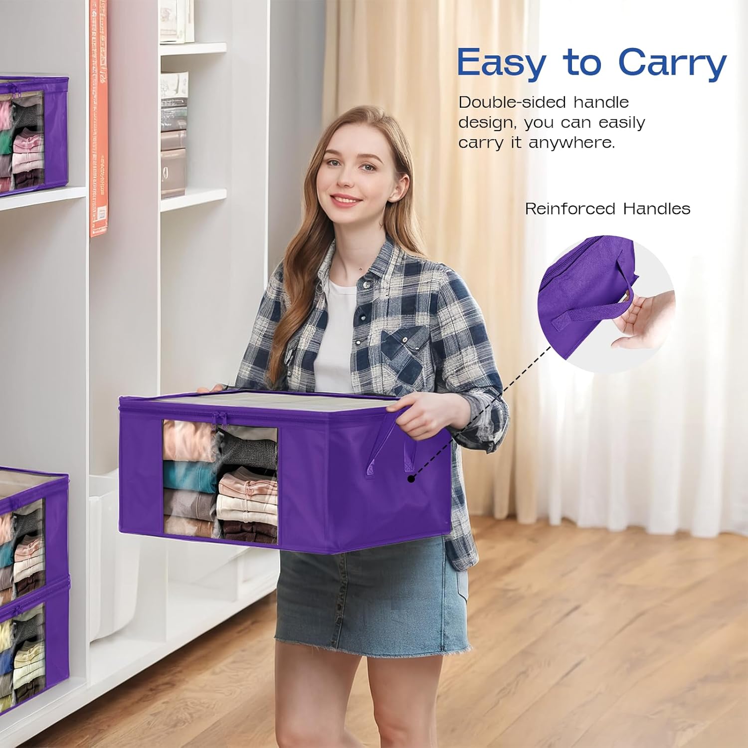 Clothes Storage Bags, Foldable Thick Fabric Blanket Storage Bags, Large Clear Window & Carry Handles, Great for Clothes, Blankets, Closets, Pillows, Toys (Purple, 4PACK)