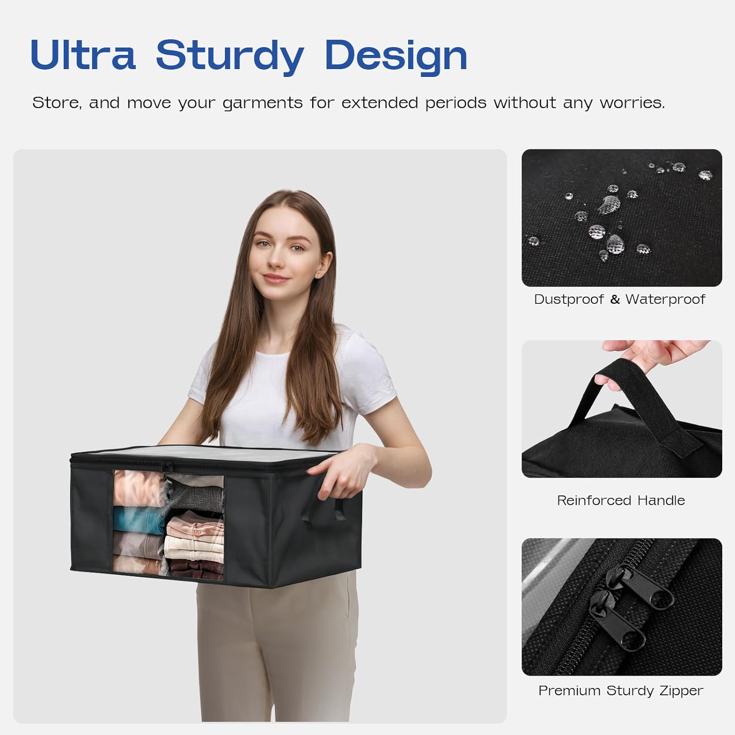 Clothes Storage Bags, Foldable Thick Fabric Blanket Storage Bags, Large Clear Window & Carry Handles, Great for Clothes, Blankets, Closets, Pillows, Toys (Black, 4PACK)