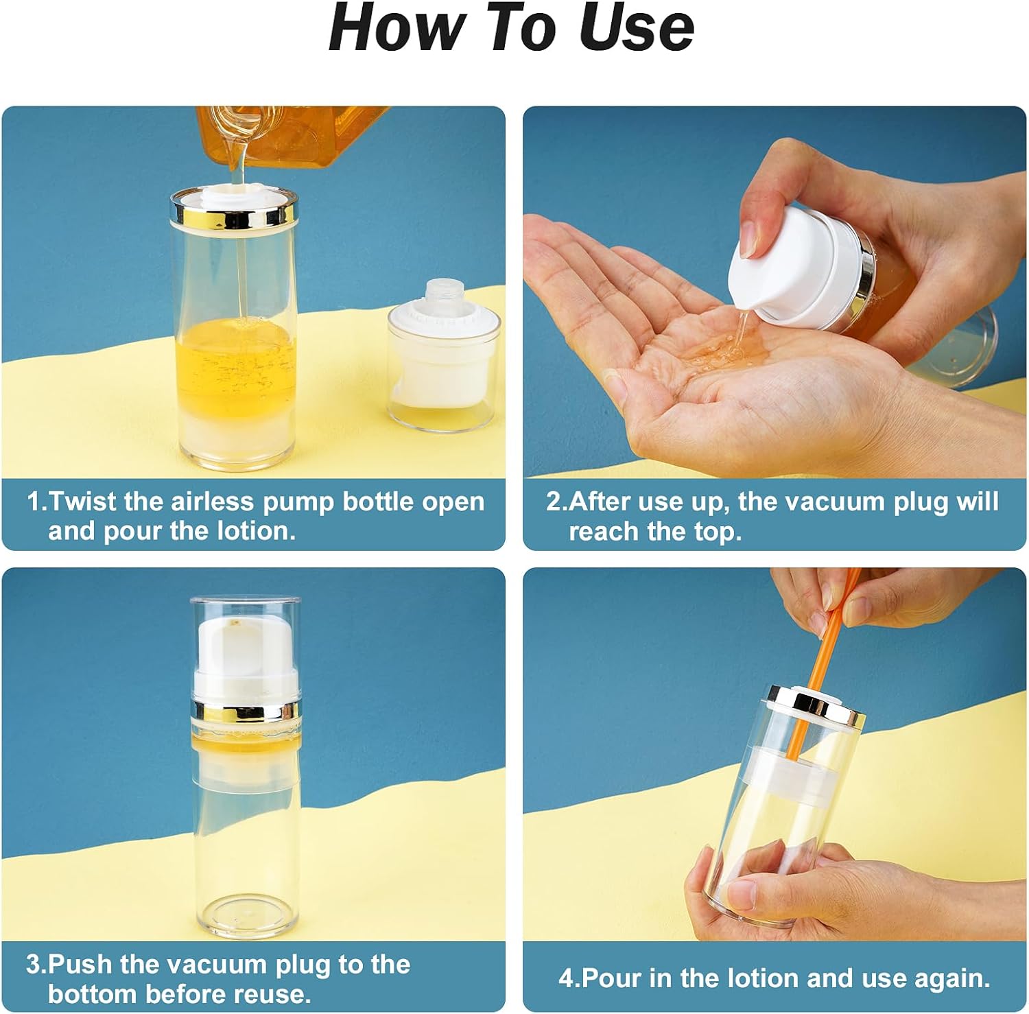 - How to Use: Step1: Twist the airless pump bottle open and pour the lotion. Step2: Press the pump and discharge the air which is in the bottle. Step3: when cosmetics are used up,the plug will rise to the top of the bottle. Step4: Before re-use, push the plug to the bottom. Step5: Pour in the lotion and use again.