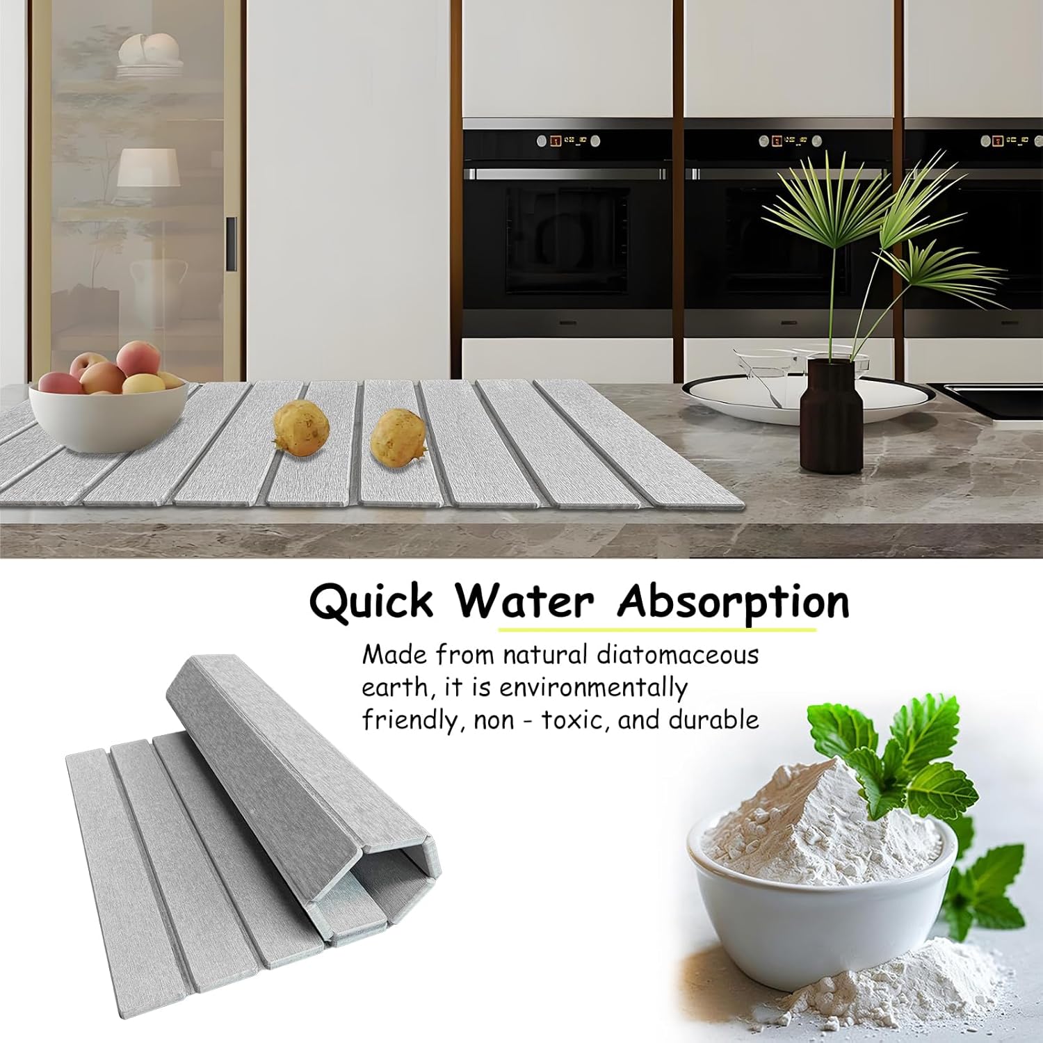 Stone Dish Drying Mat For Kitchen & Bathroom - Diatomaceous Earth, Quick Dry, Collapsible, Non - Slip Pvc, Rounded Corners, 15.4 X 23.6 IN, Absorbent, Natural Material For Dishes, Cups & More