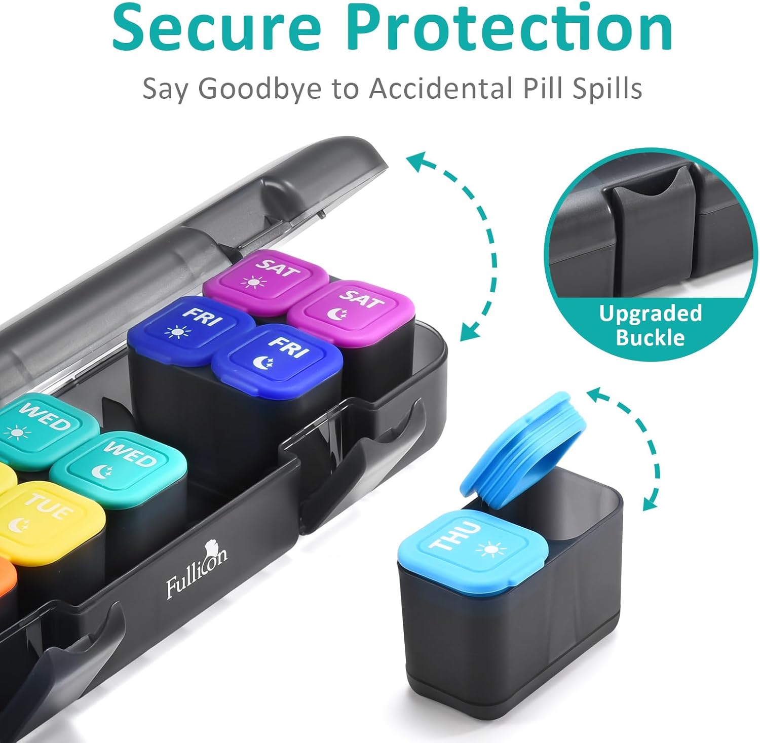 Fullicon Moisture-Proof Pill Organizer 2 Times a Day, Weekly Pill Boxes & Organiser with Silicone Lids, Large Capacity AM PM Pill Organizer 7 Day, Travel Pill Case for Vitamins (Black Rainbow)
