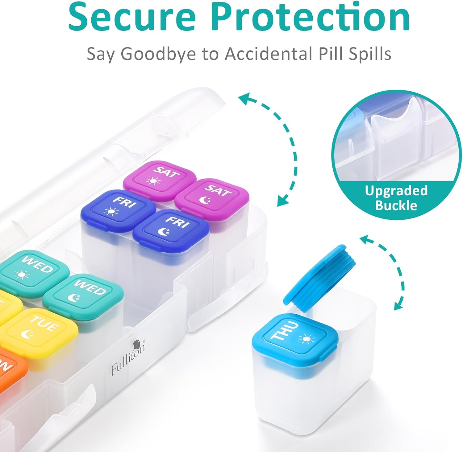 Fullicon Moisture-Proof Pill Organizer 2 Times a Day, Weekly Pill Boxes & Organiser with Silicone Lids, Large Capacity AM PM Pill Organizer 7 Day, Travel Pill Case for Vitamins (Clear Rainbow)