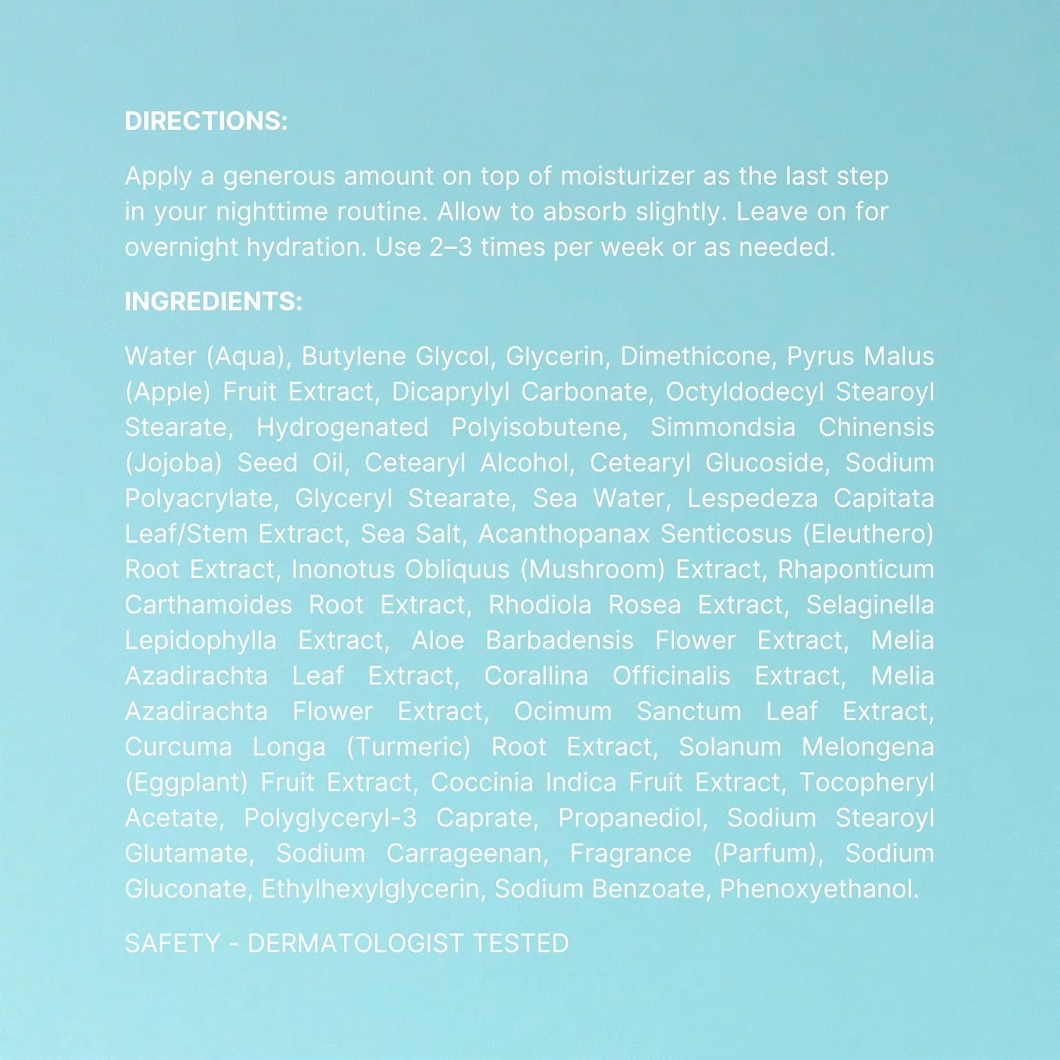 - Bioadaptive Botanicals: Infused with a blend of adaptogens including Rhodiola, Maral Root, Siberian Ginseng, and Chaga Mushroom, this mask helps your skin adapt and bounce back from daily Issues.