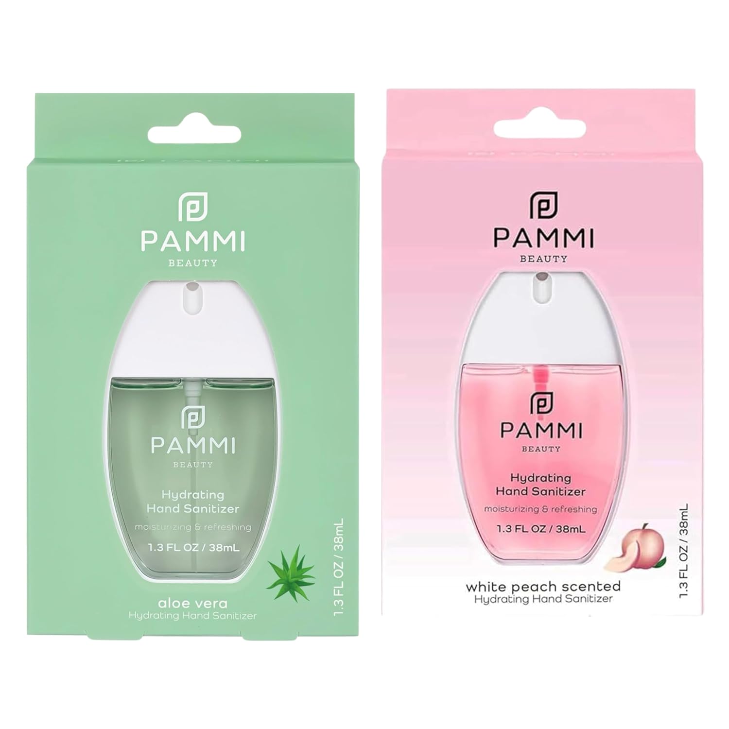PAMMI Power Mist Hydrating Hand Sanitizer Spray, Portable Travel Size Pocket Hand Sanitizer, Scented Handsanitizer Mini Spray For Car - 600 Sprays (2 Pack (Aloevera, Peach))