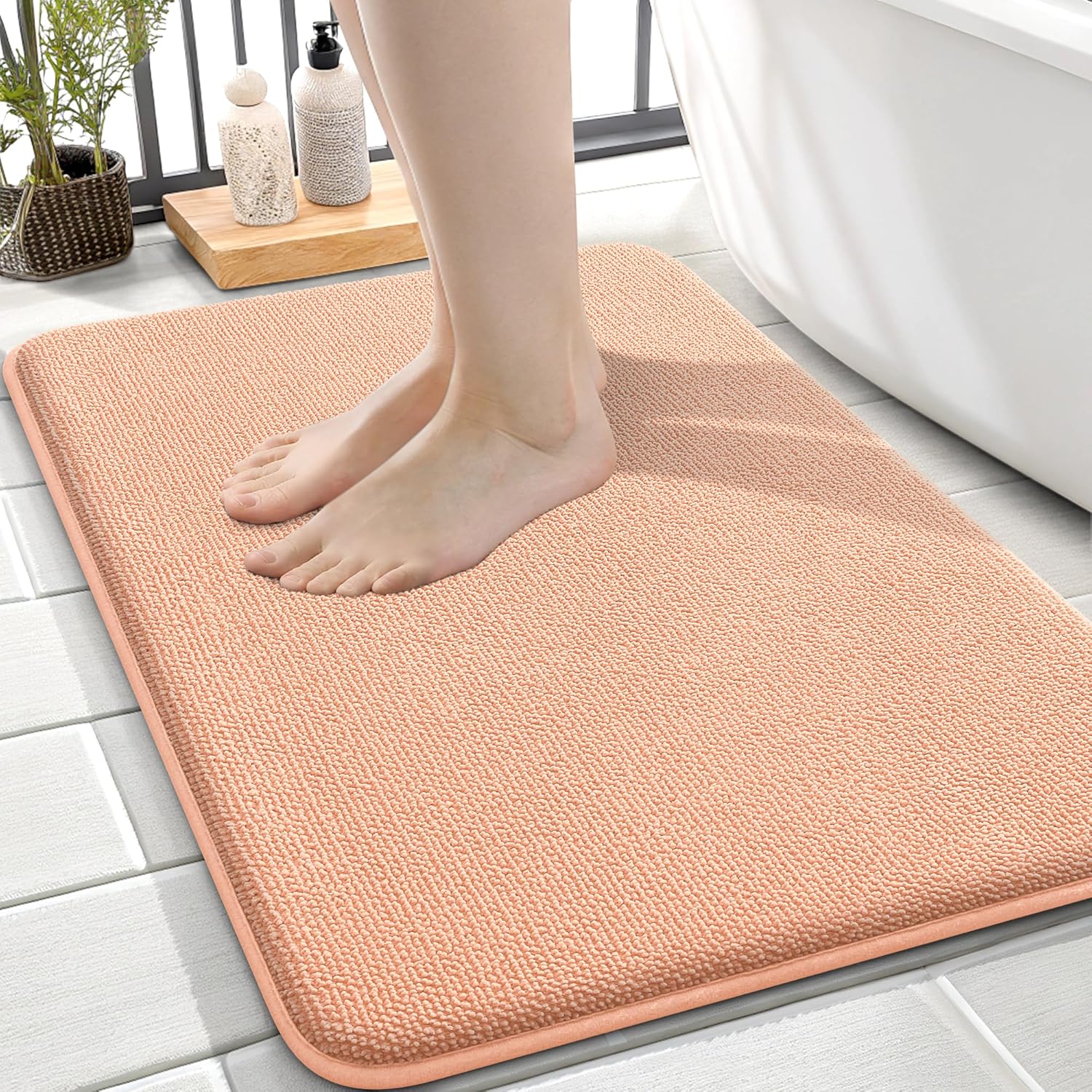 OLANLY Thick Memory Foam Bath Mat Rug 24x16, Extra Soft Absorbent Bathroom Rug, Quick Dry Bath Mats, Non-Slip, Machine Washable Carpet for Bathroom, Tub and Shower, Home Decor Accessories, Peach