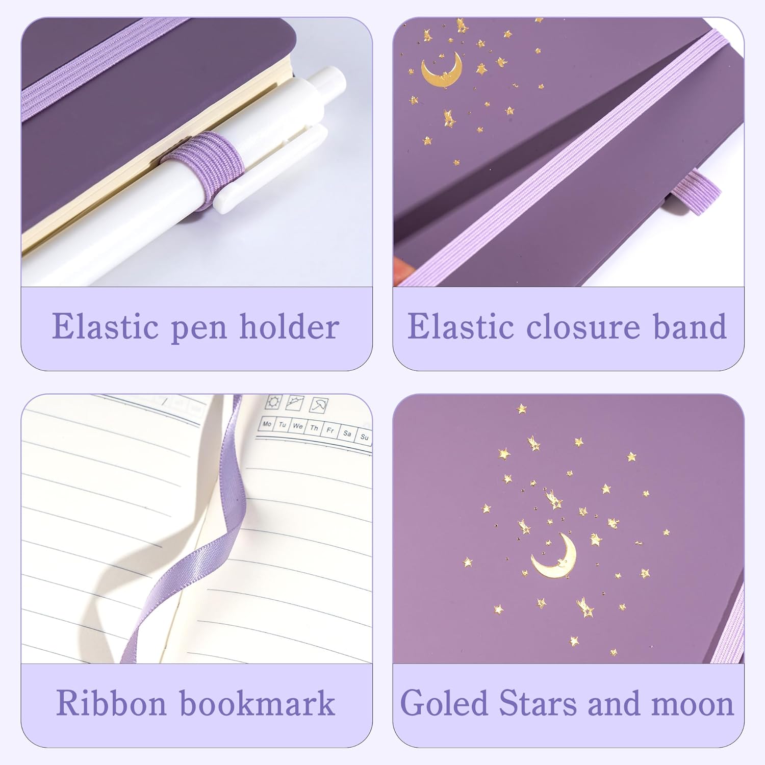 - COVERS DESIGN - A5 notebooks for work with gorgeous gold foiling pattern - moon, stars and meteor. Exquisite lined journal is the best decoration for the desk. The journal notebook cover is made of cloth, Elastic banded, Satin ribbon bookmark, Pen loop