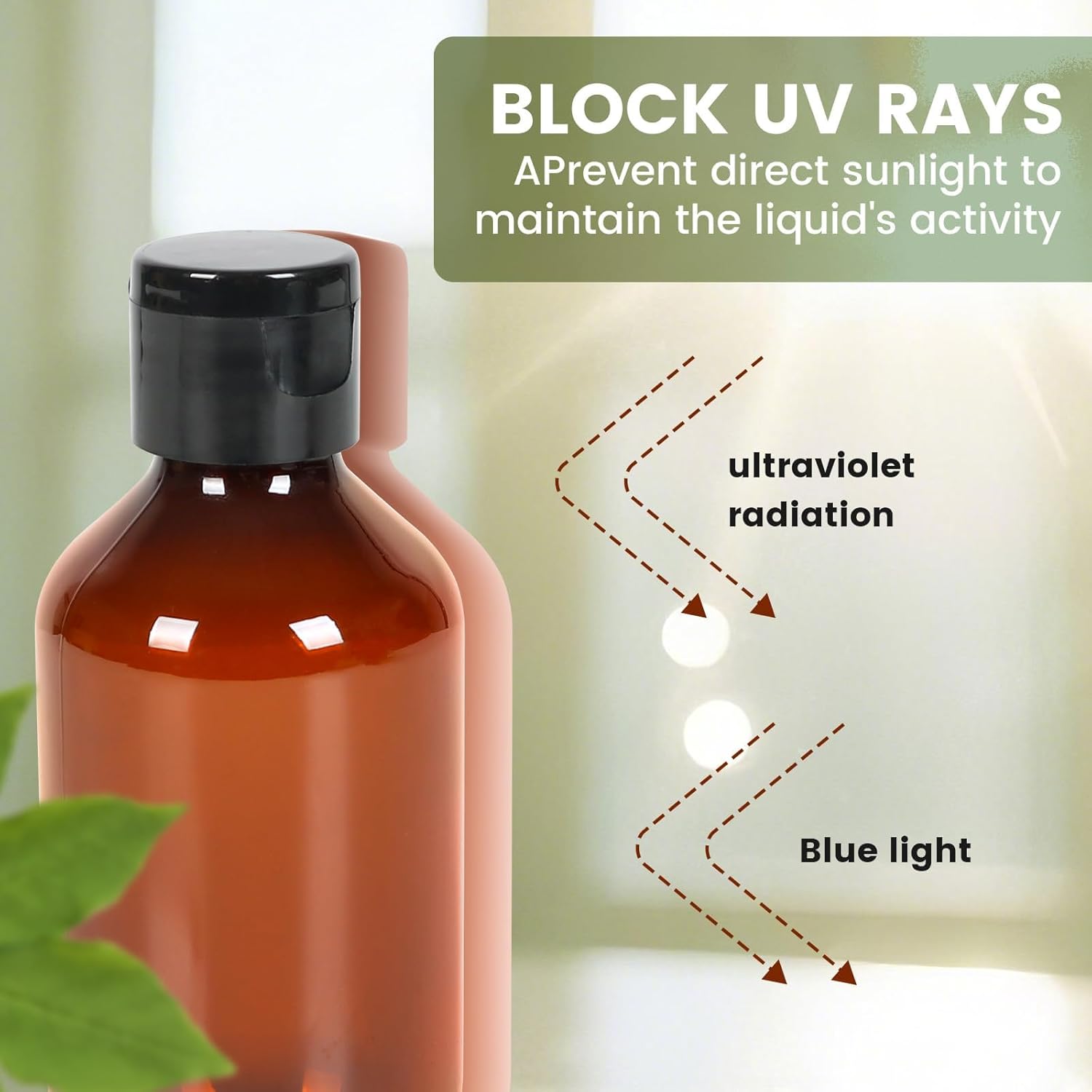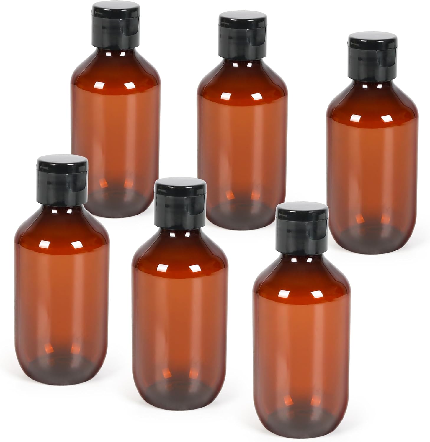 TRENDBOX Travel Size Amber Bottles with Flip Cap - 6 Pack 3.4oz Leak Proof Dispenser Containers for Toiletries, Essential Oils & Shampoo - Set of Small Empty Plastic Bottles