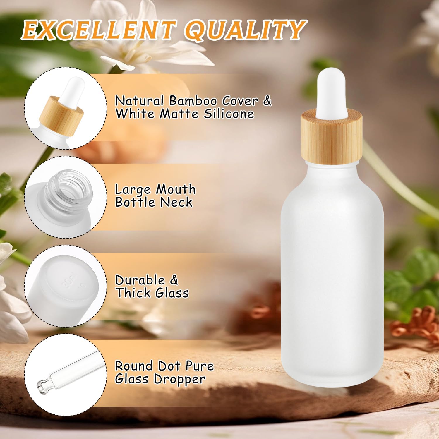 - Eye Droppers Set: 24 pack 2oz (30ml) white frosted glass eye dropper bottles.each empty glass bottle comes with a glass eye dropper and a natural bamboo lid;extra packaging included 4 pipettes, 4 funnels, and 24 blank stickers for easily to use;