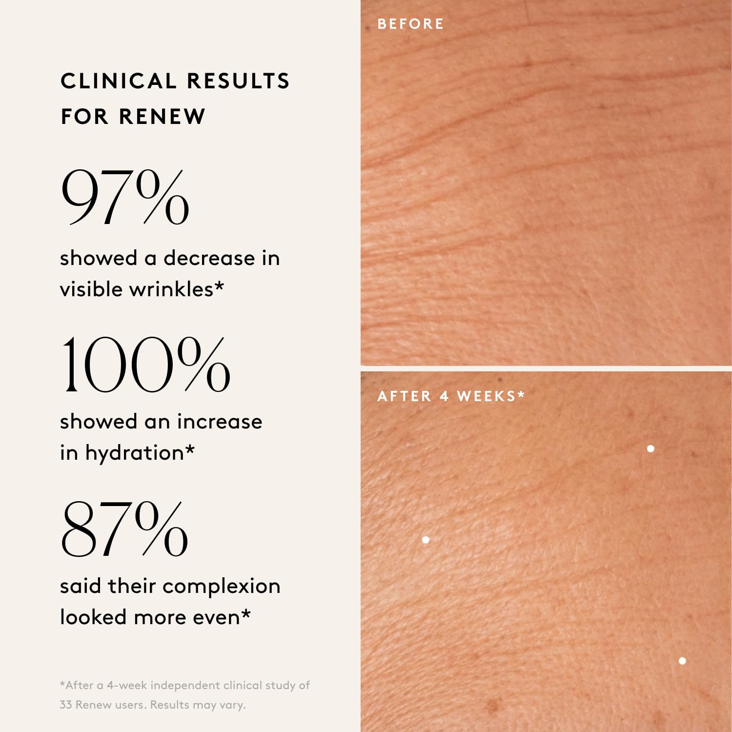 - CLINICAL RESULTS: Renew Resurfacing Night Serum delivers results you can see. In an Independent Clinical Study with Renew users, 97% showed a decrease in the appearance of fine lines and wrinkles, and 100% showed an increase in hydration.* After a 4-week independent clinical study of 31 Illuminate BC+ Brightening Serum users, 94% showed a decrease in the appearance of fine lines & wrinkles, 84% improved visible skin radiance, and 100% showed an increase in hydration.*