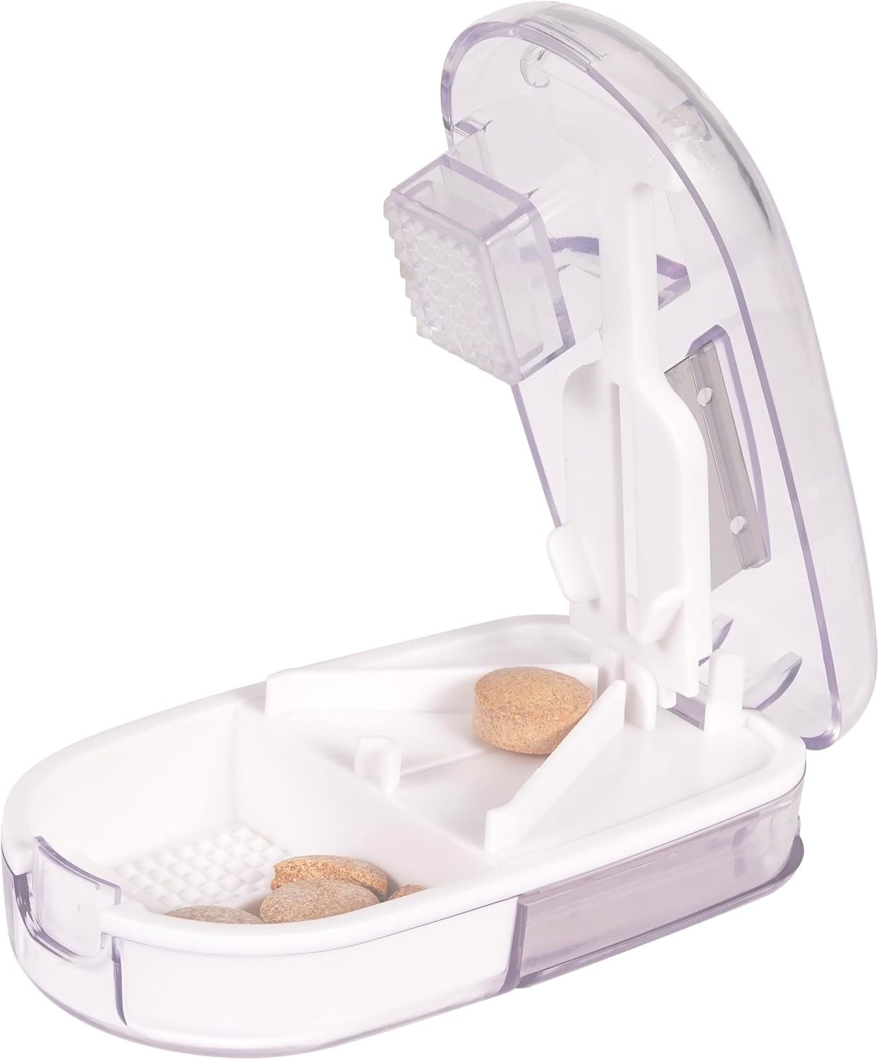 Pill Cutter Splitter for Small and Tiny Pills, or Large Pills. V-Shaped Design for Multiple Sizes. Safety Blade Guard. Loss-Proof Built-in Small Brush & Sliding Door Pill Storage (Clear)