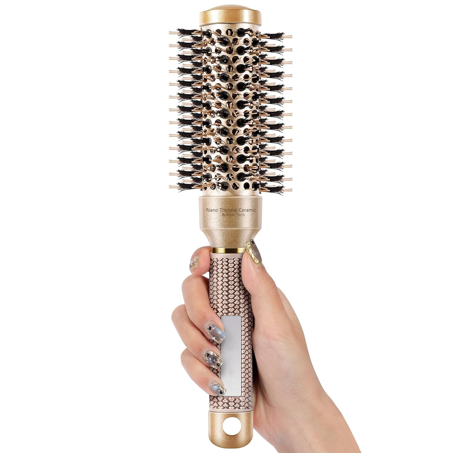Round Hair Brush for Blow Out, Nano Thermal Ceramic & Ionic Tech, 1.3 inch Barrel, Boar Bristles, Roller Brush for Blow Drying and Styling, Gold