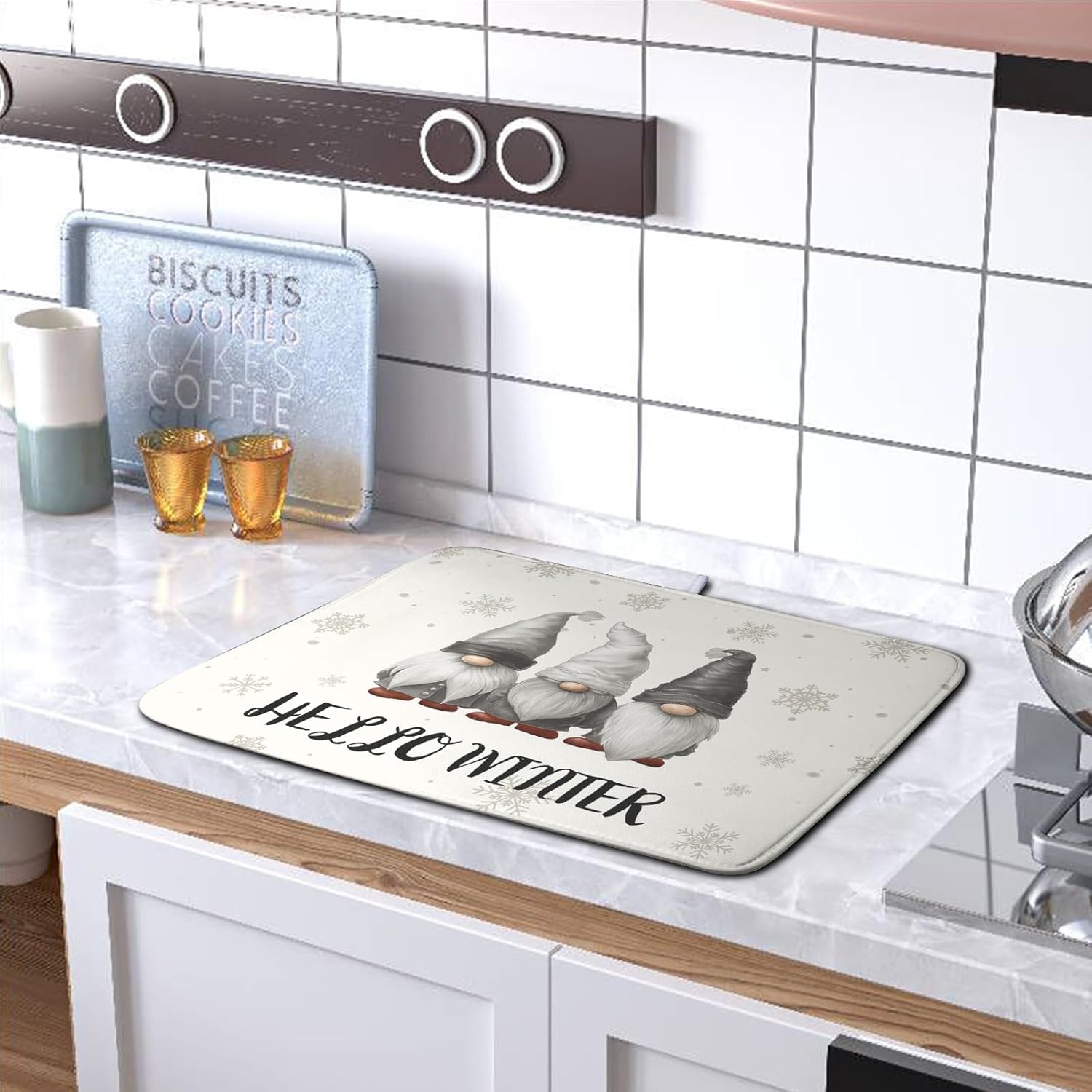 Winter Gnome Dish Drying Mat for Kitchen Counter 16x18 Christmas Snowflakes Santa Kitchen Drying Mat Hello Winter Dish Drainer Mat Super Absorbent Dish Rack Mat for Coffee Bar Countertop