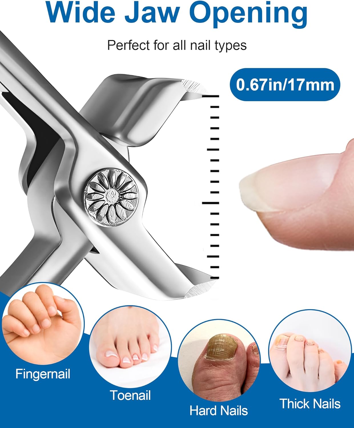- Wide Jaw Nail Clippers for Thick Nails: With a 17mm extra-wide opening, these large nail clippers easily cut thick toenails and hard fingernails; The labor-saving lever boosts cutting power for a clean, precise trim with minimal effort