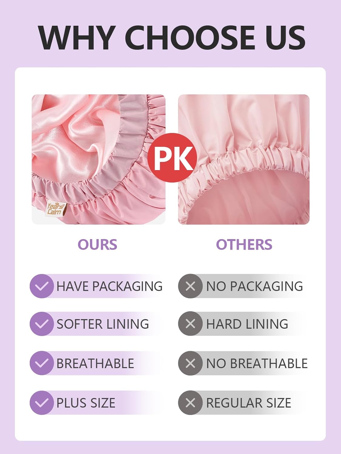 - Waterproof Hair Protection: Made with a dual-layer design, featuring waterproof memory cotton and a soft satin lining, our shower cap prevents water from soaking through and helps protect your hair from damage. Ideal for all hair types, including long hair