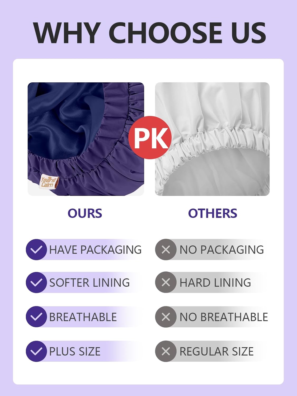 - Waterproof Hair Protection: Made with a dual-layer design, featuring waterproof memory cotton and a soft satin lining, our shower cap prevents water from soaking through and helps protect your hair from damage. Ideal for all hair types, including long hair