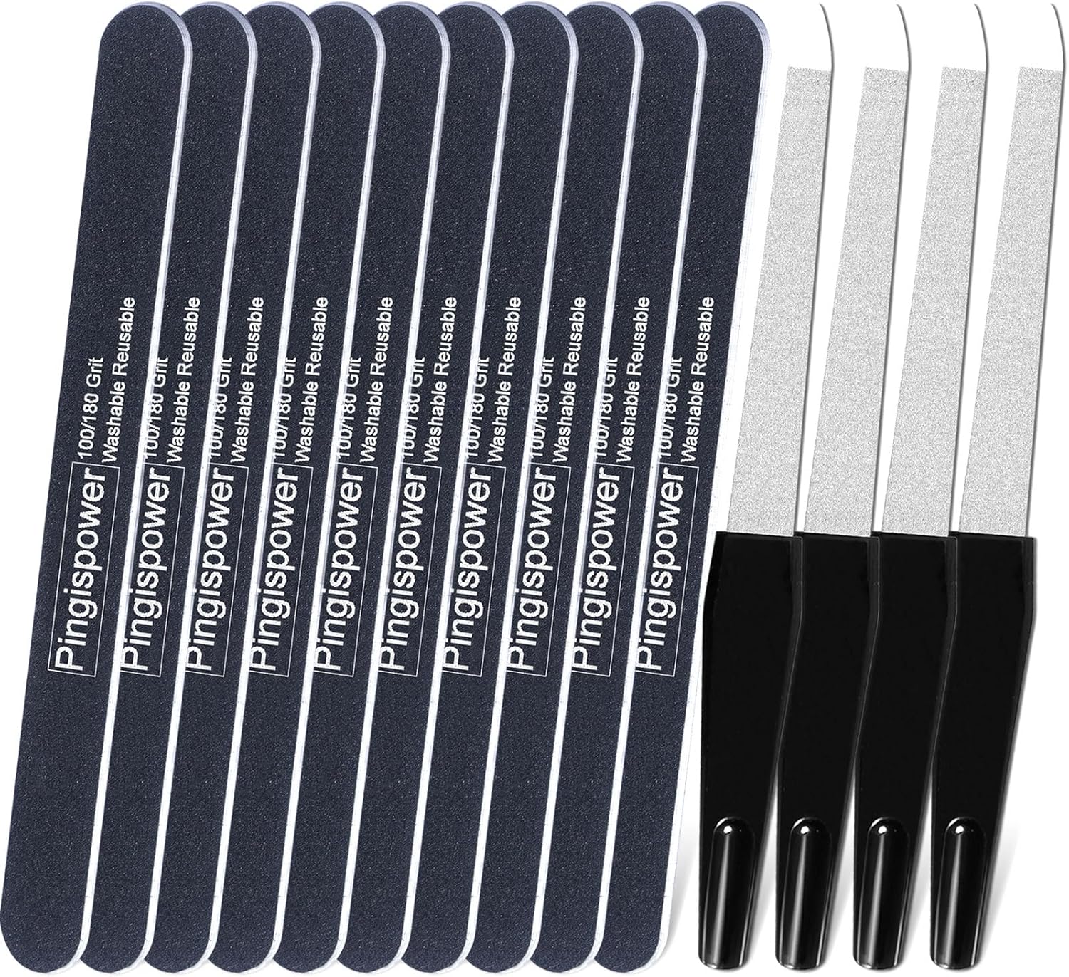 - 【 PREMIUM DUAL MATERIALS NAIL FILE SET 】14PCS nail file set includes: 4PCS stainless steel metal nail files ( ABS non-slip handle, double-sided medium/fine grit ) + 10PCS Korean emery board nail files ( 100/180 grit ) for natural / acrylic / gel nails care.