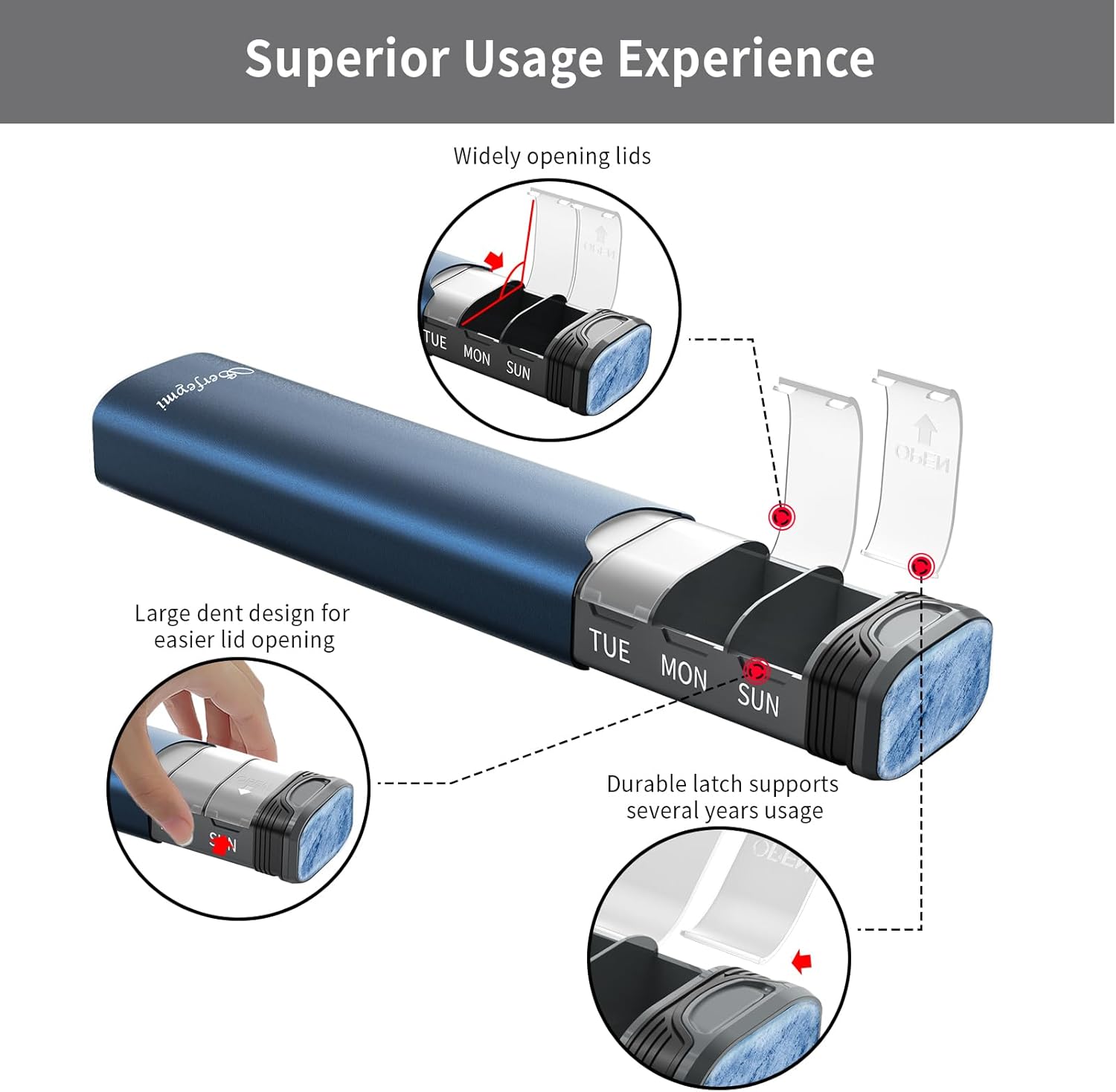 - UPGRADED INDIVIDUAL LIDS- Unlike the lids of most pill boxes on the market that use plastic hinges (which can cause the lid to detach due to plastic fatigue), our design employs a latch mechanism that ensures the lid remains securely in place for years without detaching. Thanks to the ergonomic design, the lid's optimal tension ensures ease of use without excessive tightness, making it arthritis-friendly for effortless access