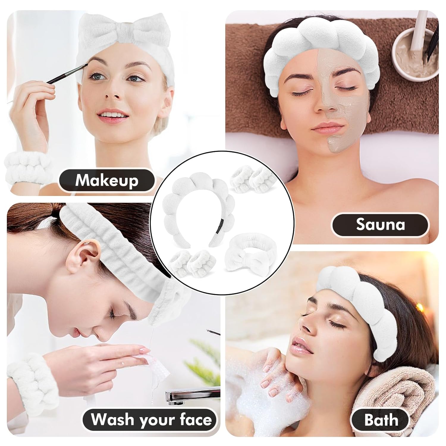 - SPA HEADBAND AND WRISTBAND MATERIAL: Patent No.: US D1018980 S.Spa headband and wristband set is the perfect gift solution.Bubble Spa headband for women the sponge lining used and the terry cloth covering the surface. These skincare headbands have a strong water absorption function and can be used when you are washing your face, skincare or makeup. And wristbands also have good elasticity, can be stretched to fit your wrist better.Preppy skincare headband, grwm headband