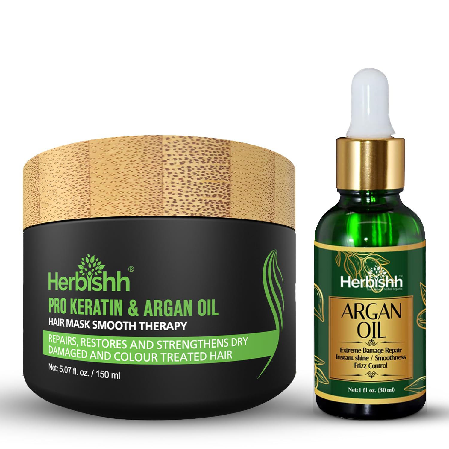 - COMPLETE HAIR CARE SOLUTION – Transform your hair care routine with the Herbishh Argan Oil & Hair Mask Combo! Combining the power of pure Moroccan argan oil for frizz control and deep conditioning benefits of argan hair mask, this hair care combo is a must-have for achieving soft, shiny and healthy locks.