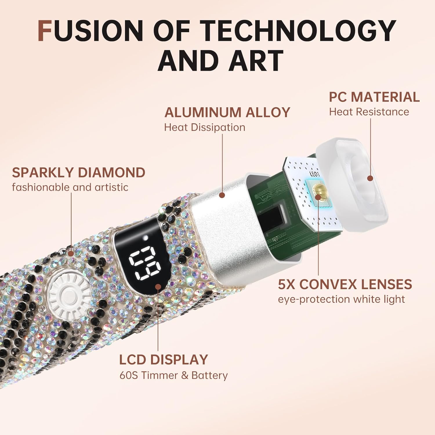 - 【Diamond Surface and 5X fast Curing】This uv nail light adopts an eye-catching shiny and fashionable diamond surface design.Equipped with high-quality lamp beads emitting 365 + 405nm and convex lens to achieve 5 times amplified spotlight, suitable for most gel nails and reduces curing time and ensures evenly curing from multiple angles