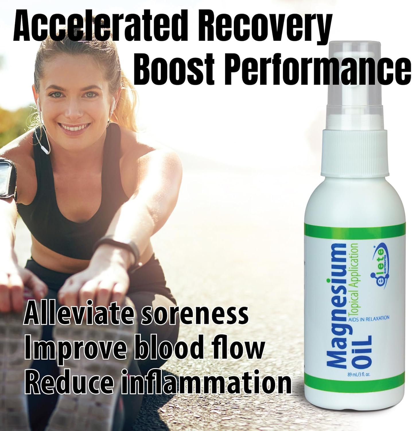- A MAGNESIUM SPRAY FOR ATHLETES - Accelerate Muscle Recovery. Speed up your recovery time with elete topical magnesium oil spray, designed to quickly absorb and alleviate post-workout muscle soreness and fatigue.