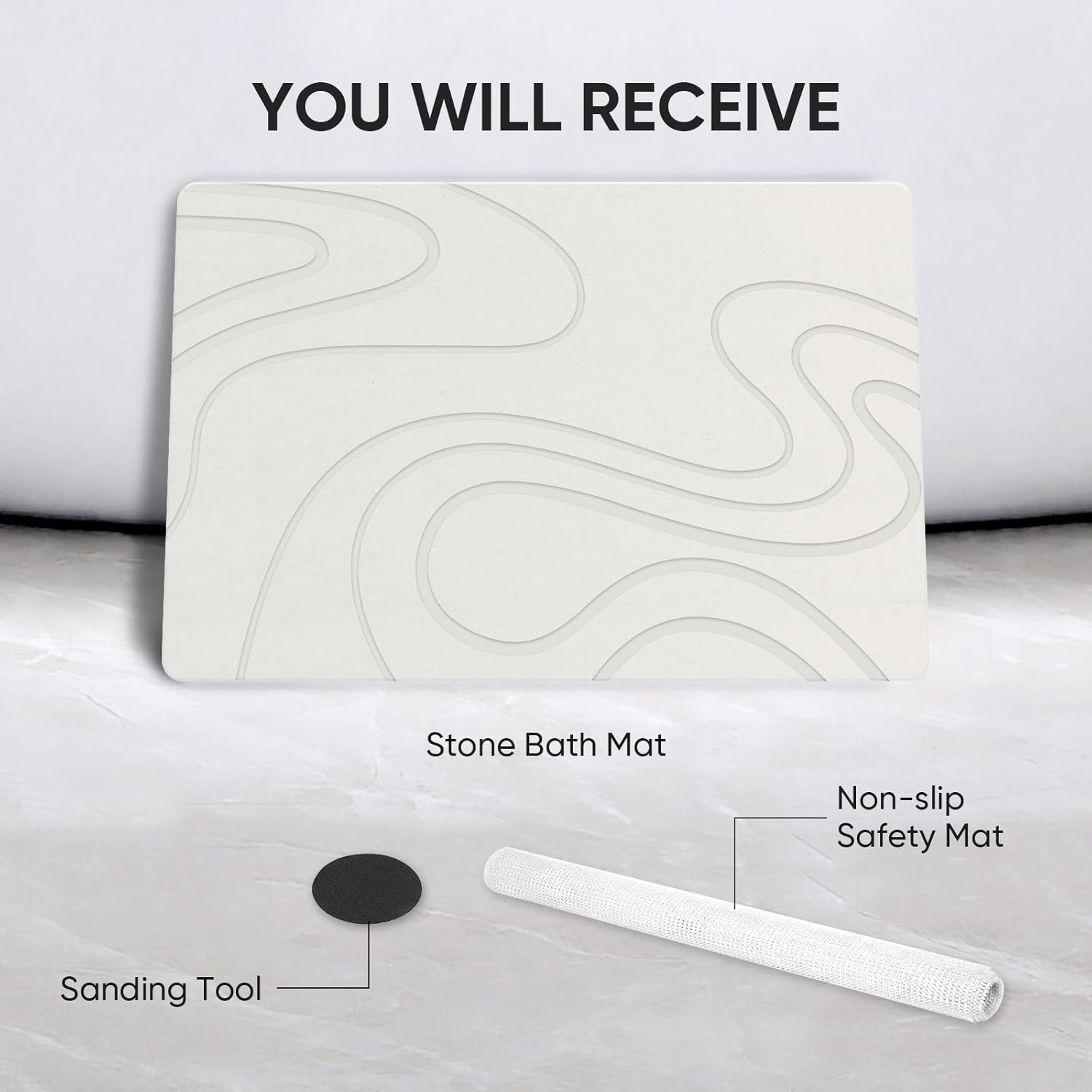 - 【Non-Slip Design】Enhance your bath safety with our diatomite stone bath mat featuring a textured surface for added friction and an included rubber anti-slip mat for double protection. Placing a non-slip mat beneath it ensures the stone mat stays securely in place while preserving your floor