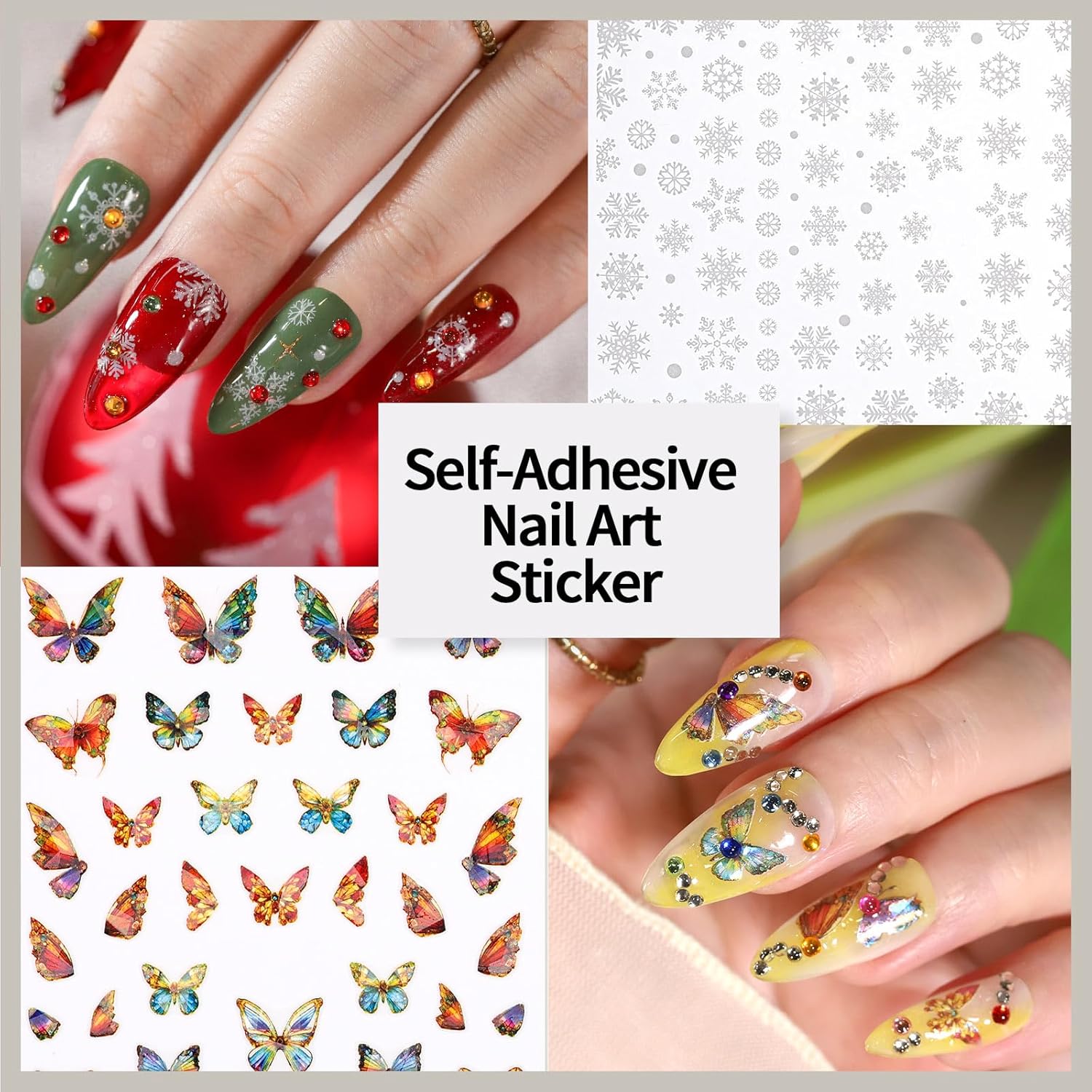 - Assorted Nail Stickers For Nail Art: 6 pcs self-adhesive nail stickers in different patterns, such as butterfly, colorful laser flower, snowflake. 3 type of butterfly patterns, like pink, blue mixed gold,geometrical gloss. 2 type of snowflake nail stickers in white and gold glitter, suit for winter or Christmas nail decals. Tear off the nail art stickers with tweezers and stick it on nail.Press lightly to ensure the decal stays firmly on nails.Use top coat to seal it completely and last longer.