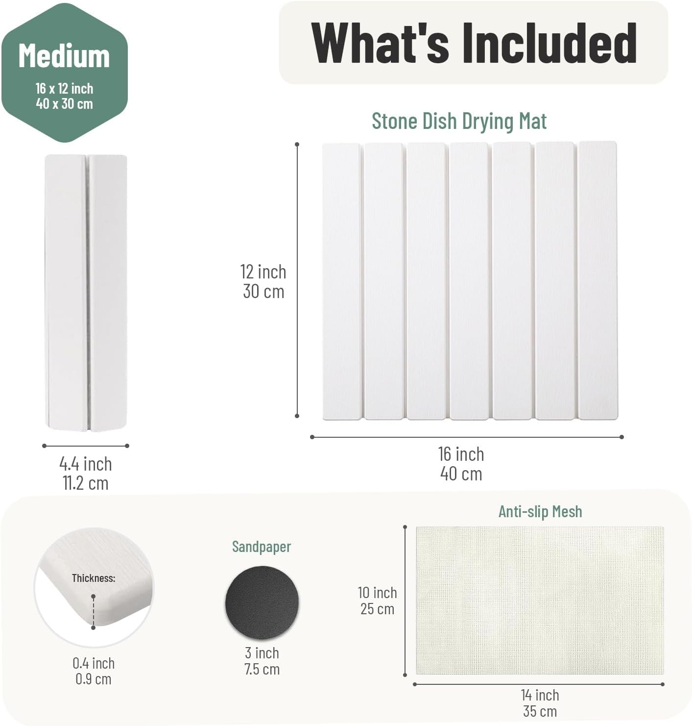 Stone Drying Mat for Kitchen Counter 16"x12" – Quick Dry Diatomaceous Earth Mat for Sink, Dishes, Cups & Soap – Foldable, Food-Grade Absorbent Countertop Mat for Kitchen, Bathroom & Dish Rack