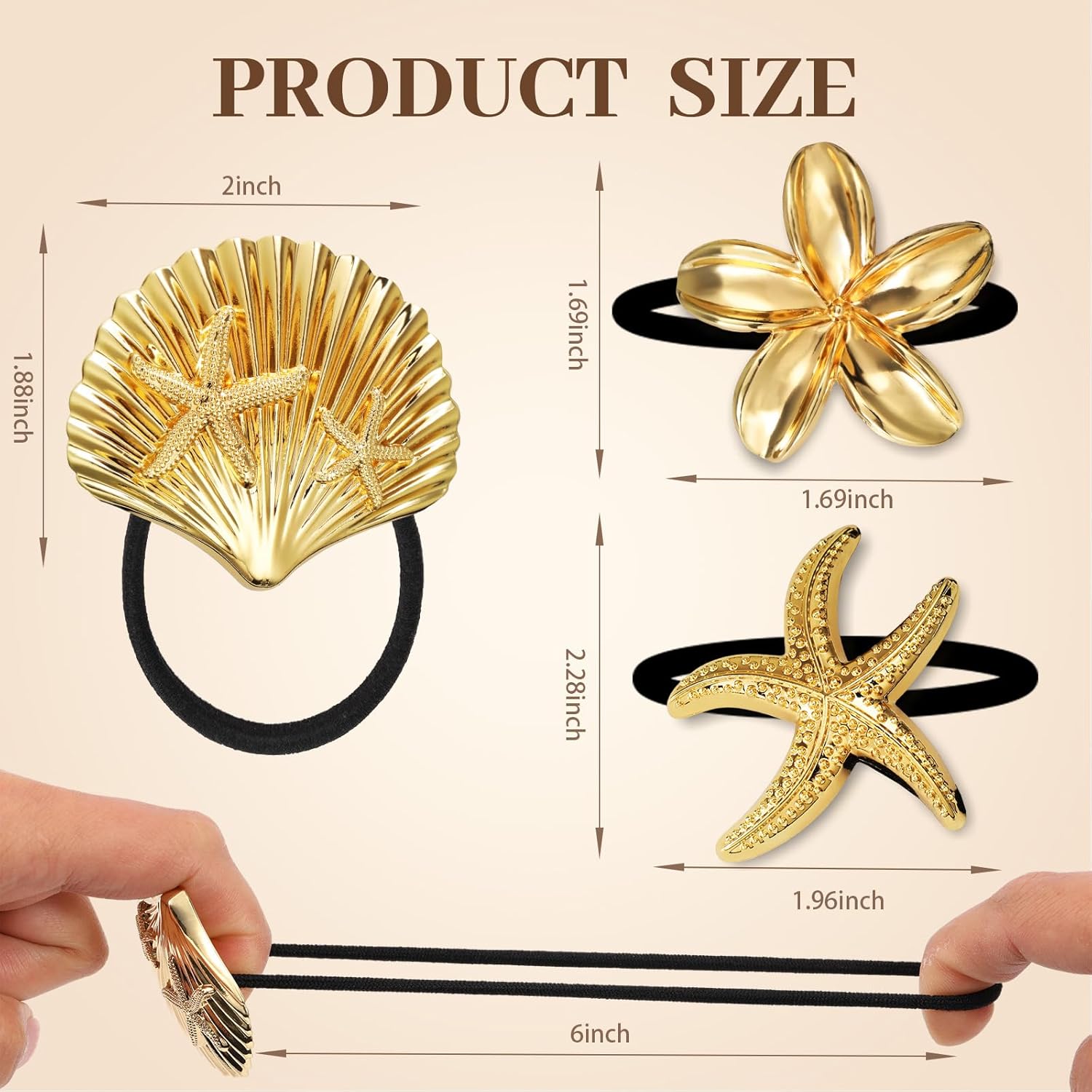 - OCEAN-INSPIRED GOLD HAIR ACCESSORIES FOR WOMEN: Adorned with seashells, starfish, and floral motifs, these metal hair ties bring a summery vibe to any outfit, blending fashion with effortless charm
